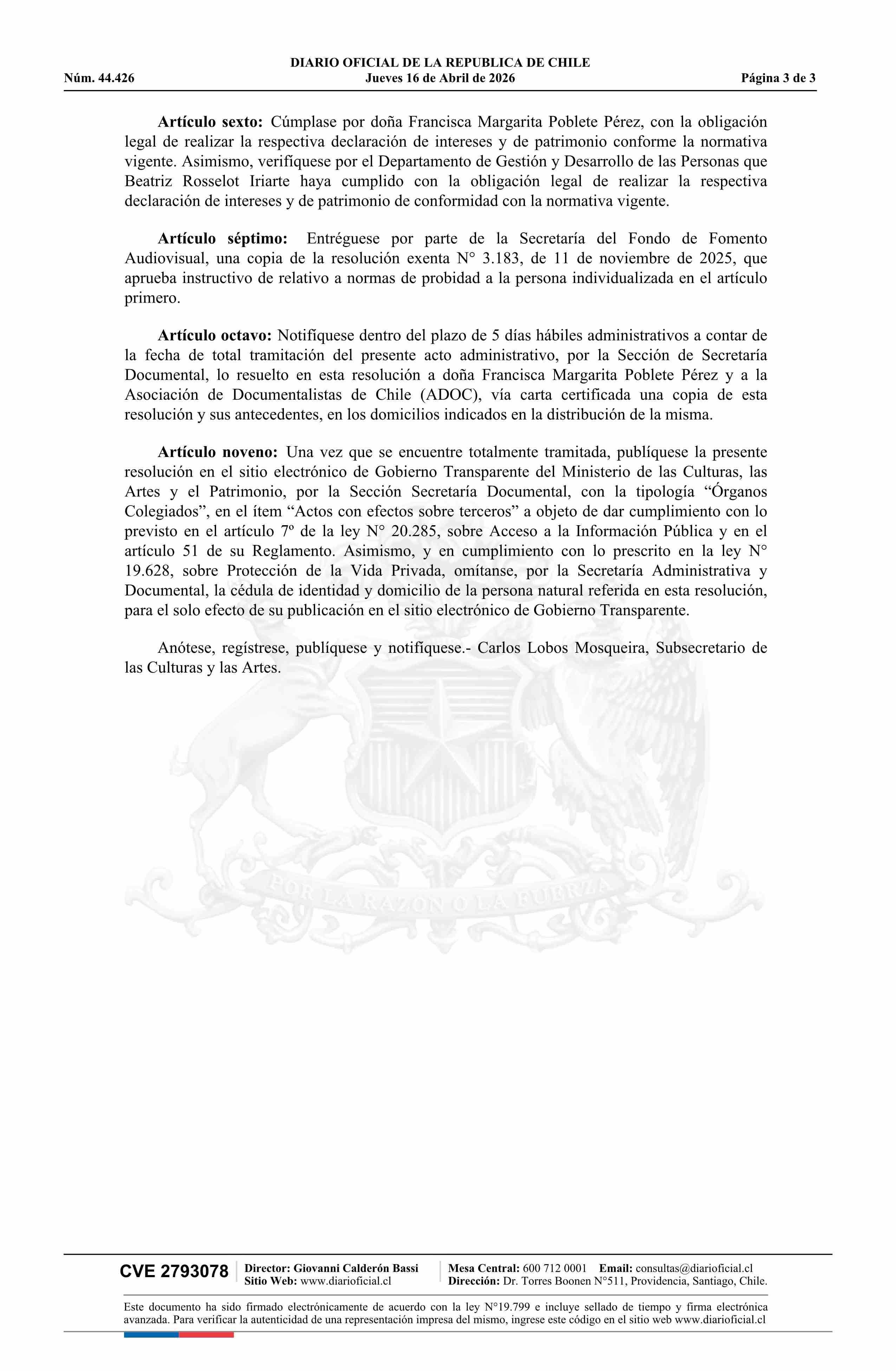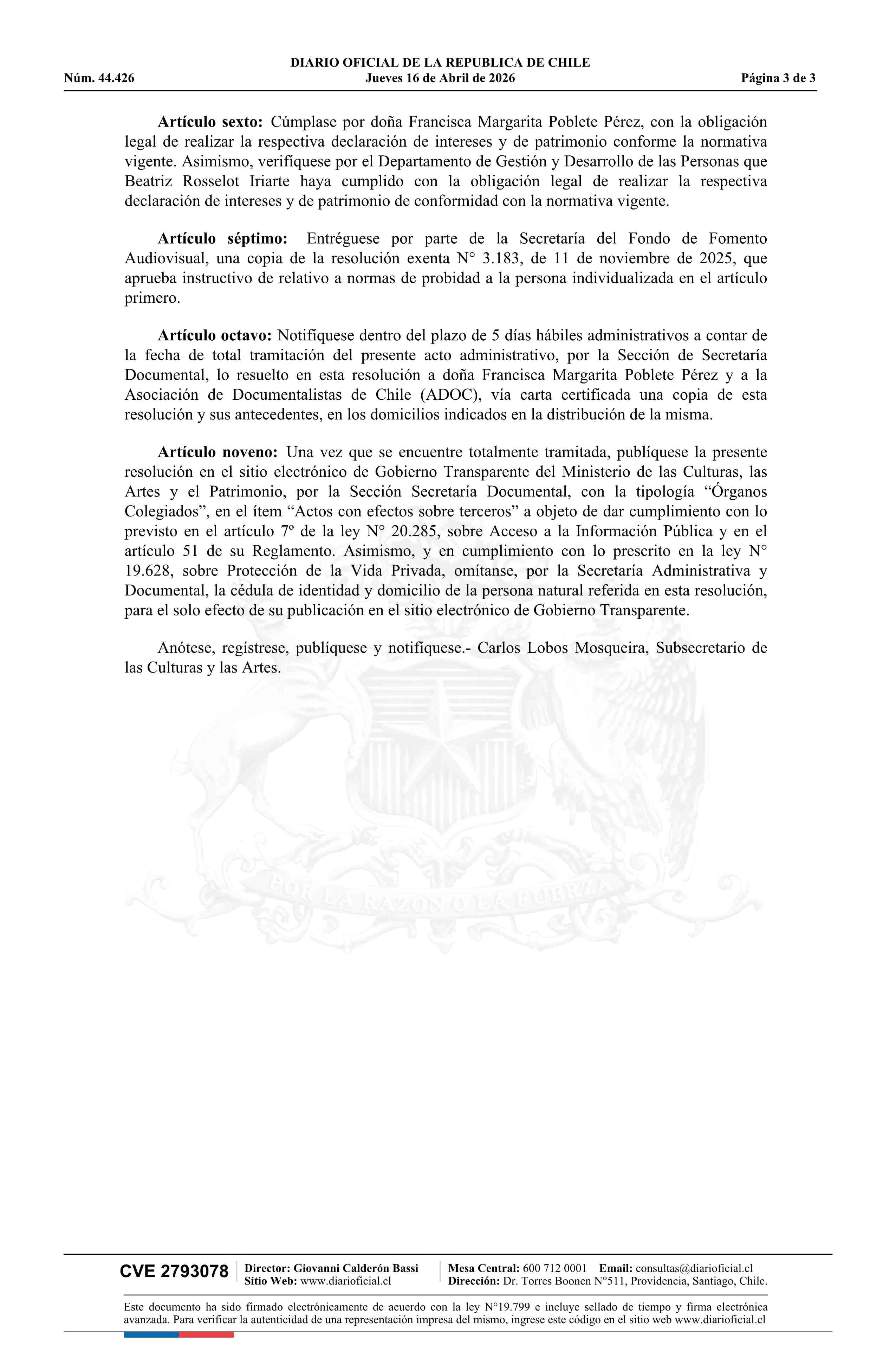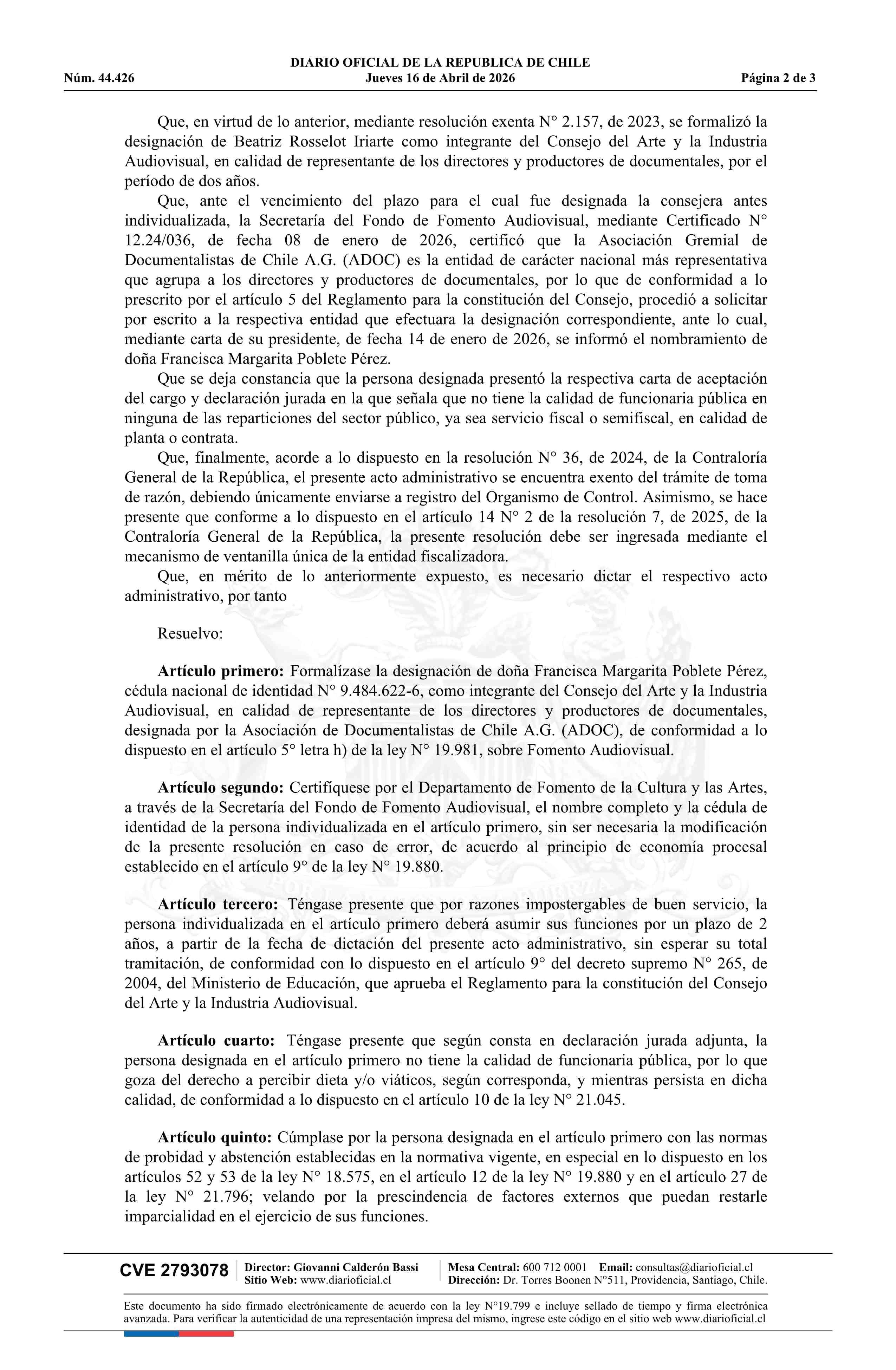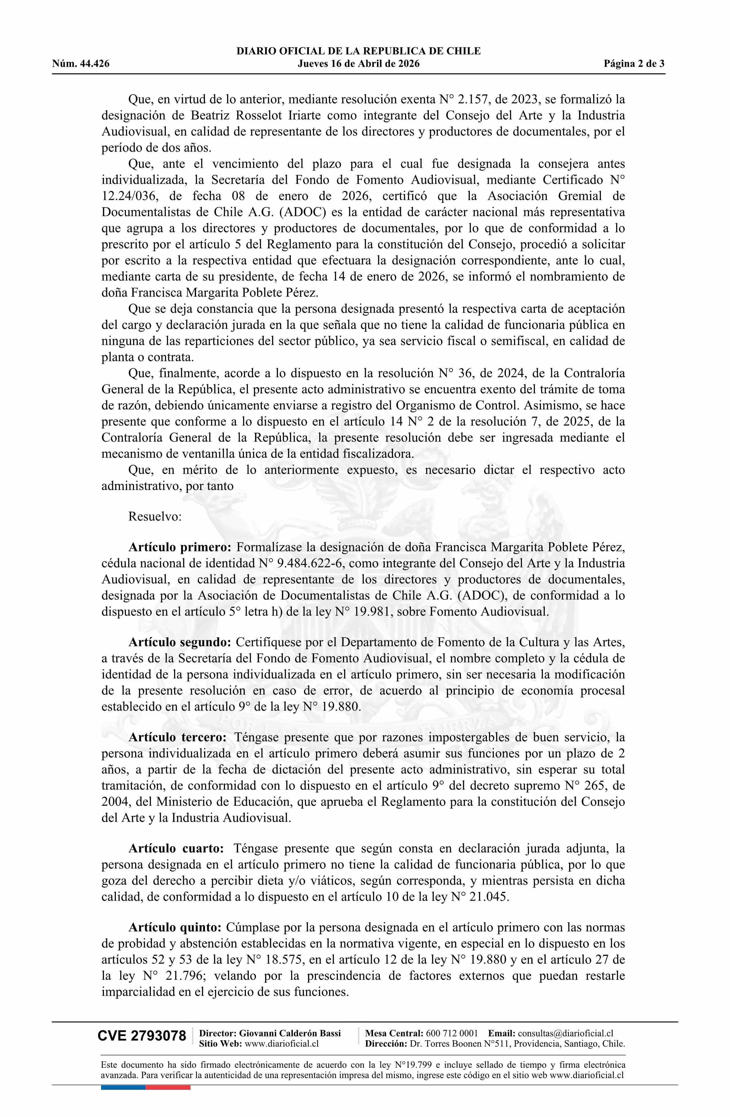 Resolución exenta número 913, de 2026.- Formaliza designación de doña Francisca Margarita Poblete Pérez como integrante del Consejo del Arte y la Industria Audiovisual