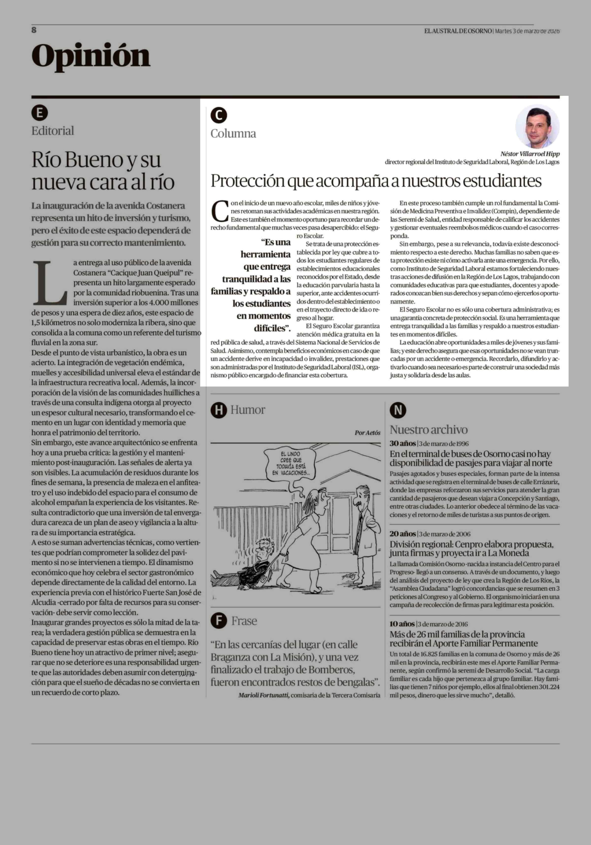 Columnas de Opinión: Protección que acompaña a nuestros estudiantes 03-03-2026 El Austral de Osorno |