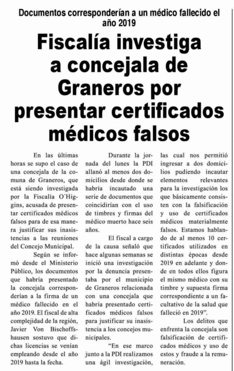 Fiscalía investiga a concejala de Graneros por presentar certificados médicos falsos 18-06-2025 Diario VI Región |
