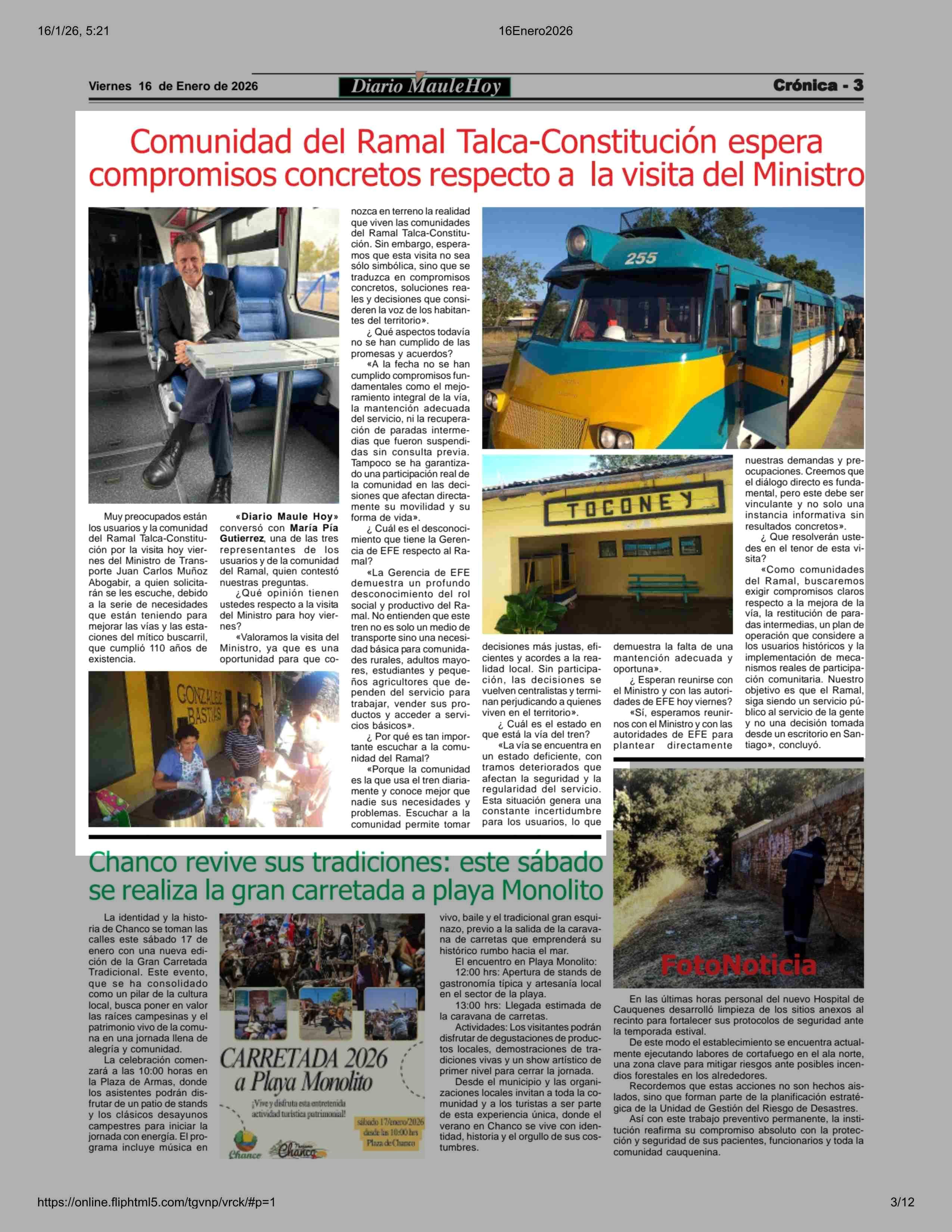 Comunidad del Ramal Talca-Constitución espera compromisos concretos respecto a la visita del Ministro 16-01-2026 Maule Hoy |