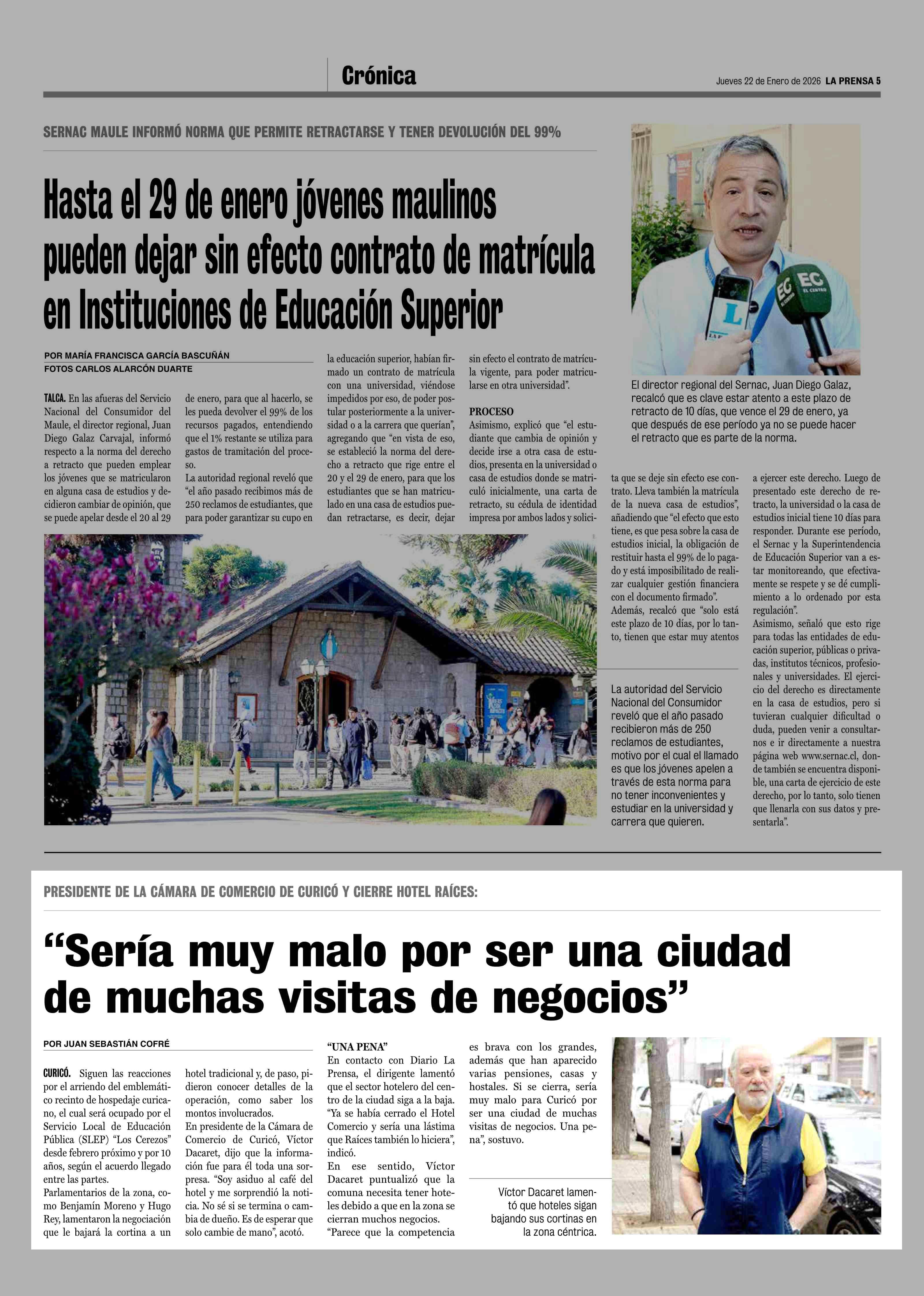 "Sería muy malo por ser una ciudad de muchas visitas de negocios" 22-01-2026 La Prensa de Curicó |