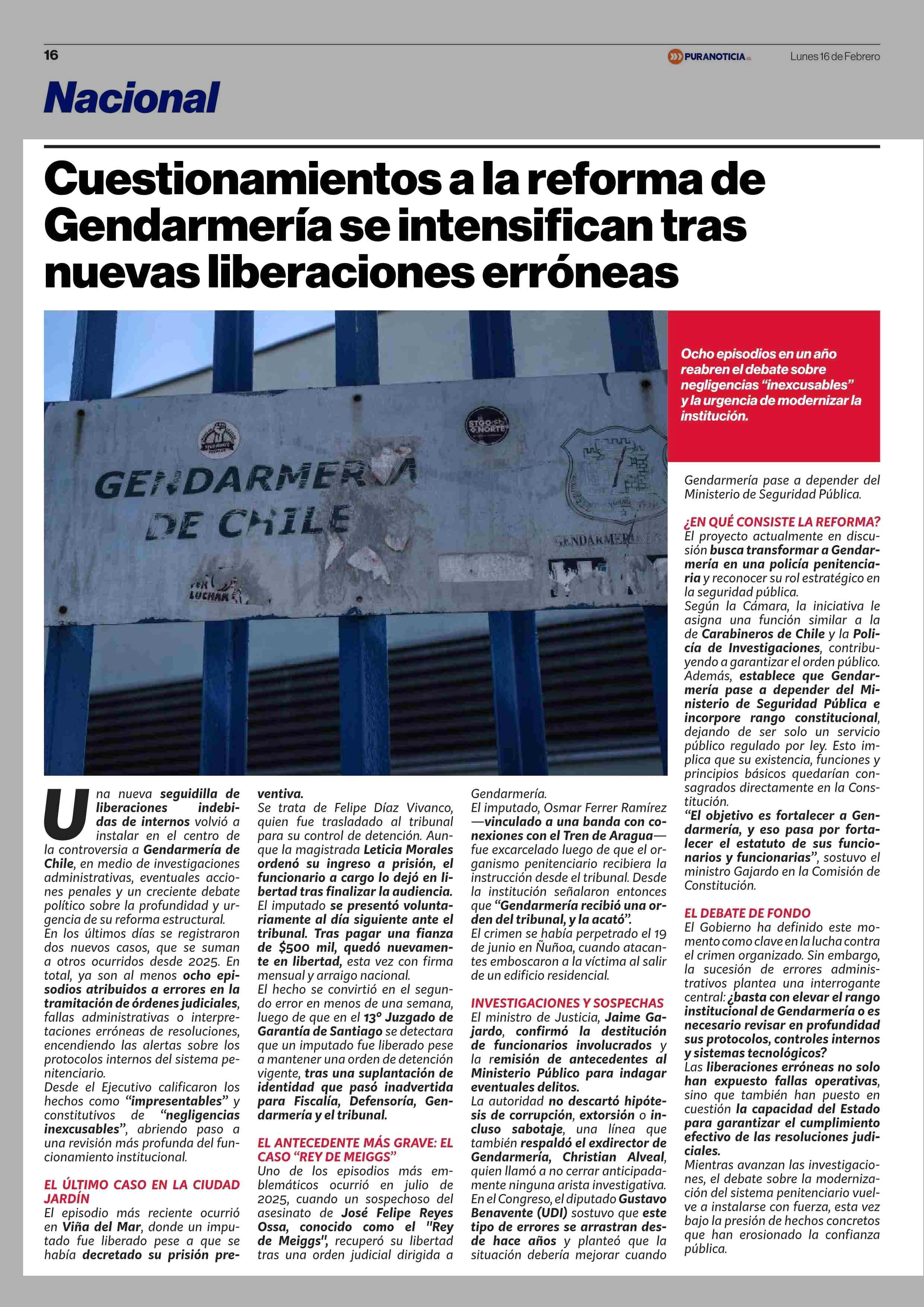 Cuestionamientos a la reforma de Gendarmería se intensifican tras nuevas liberaciones erróneas 16-02-2026 Puranoticia.cl |