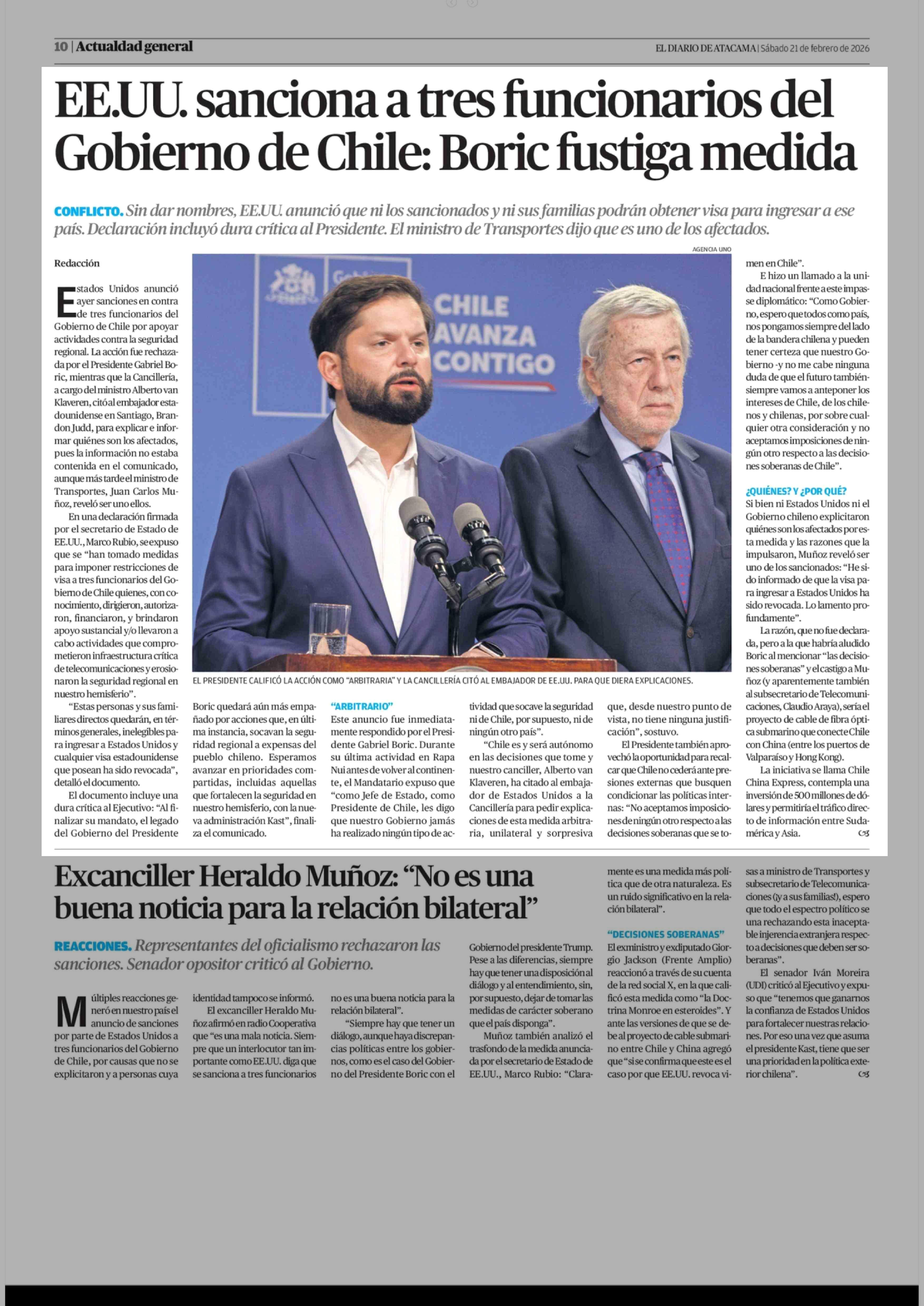 EE.UU. sanciona a tres funcionarios del Gobierno de Chile: Boric fustiga medida 21-02-2026 El Diario de Atacama |