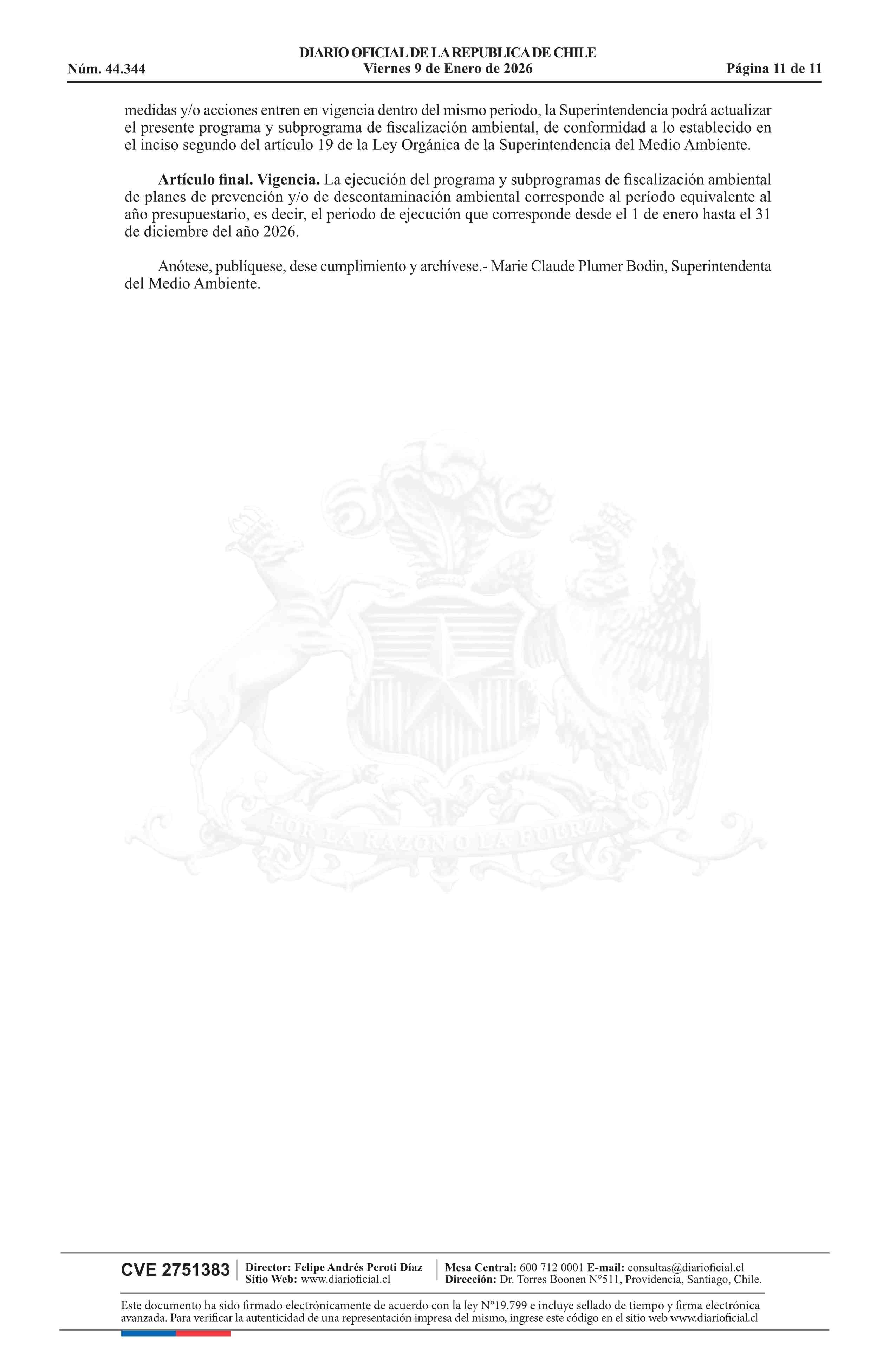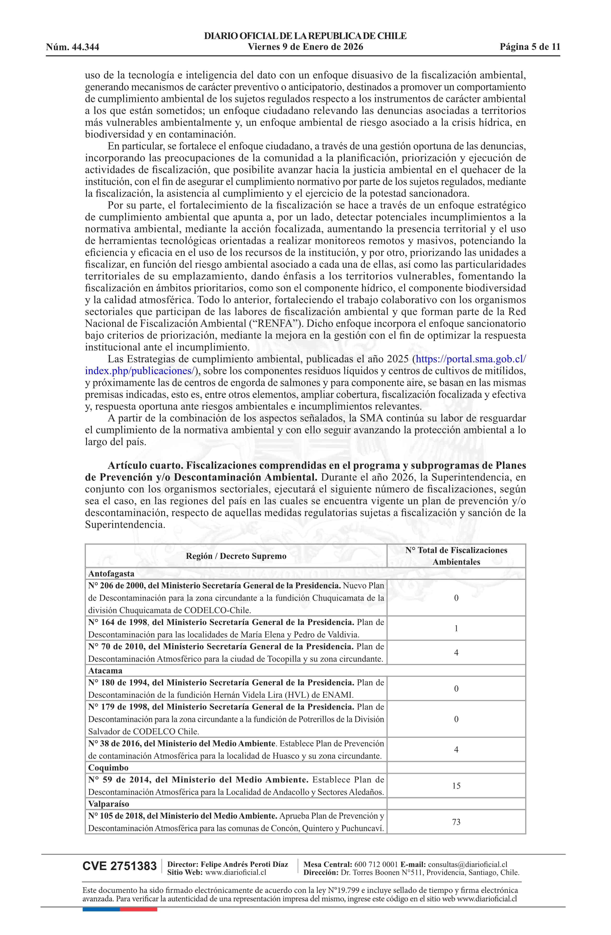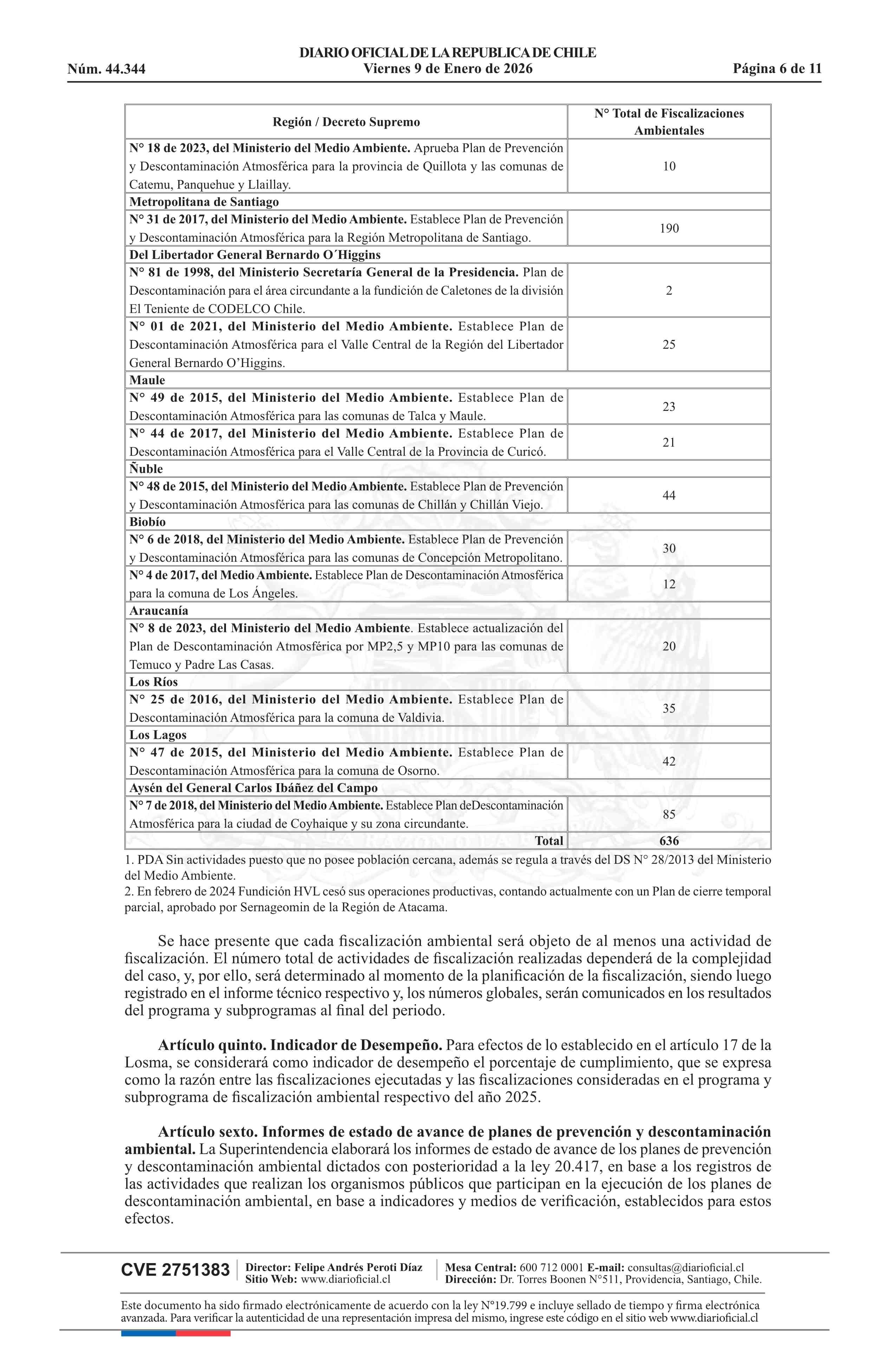 Resolución exenta número 2.998, de 2025.- Fija programa y subprogramas de fiscalización ambiental de planes de prevención y/o descontaminación para el año 2026 09-01-2026 Diario Oficial Edición Electrónica |