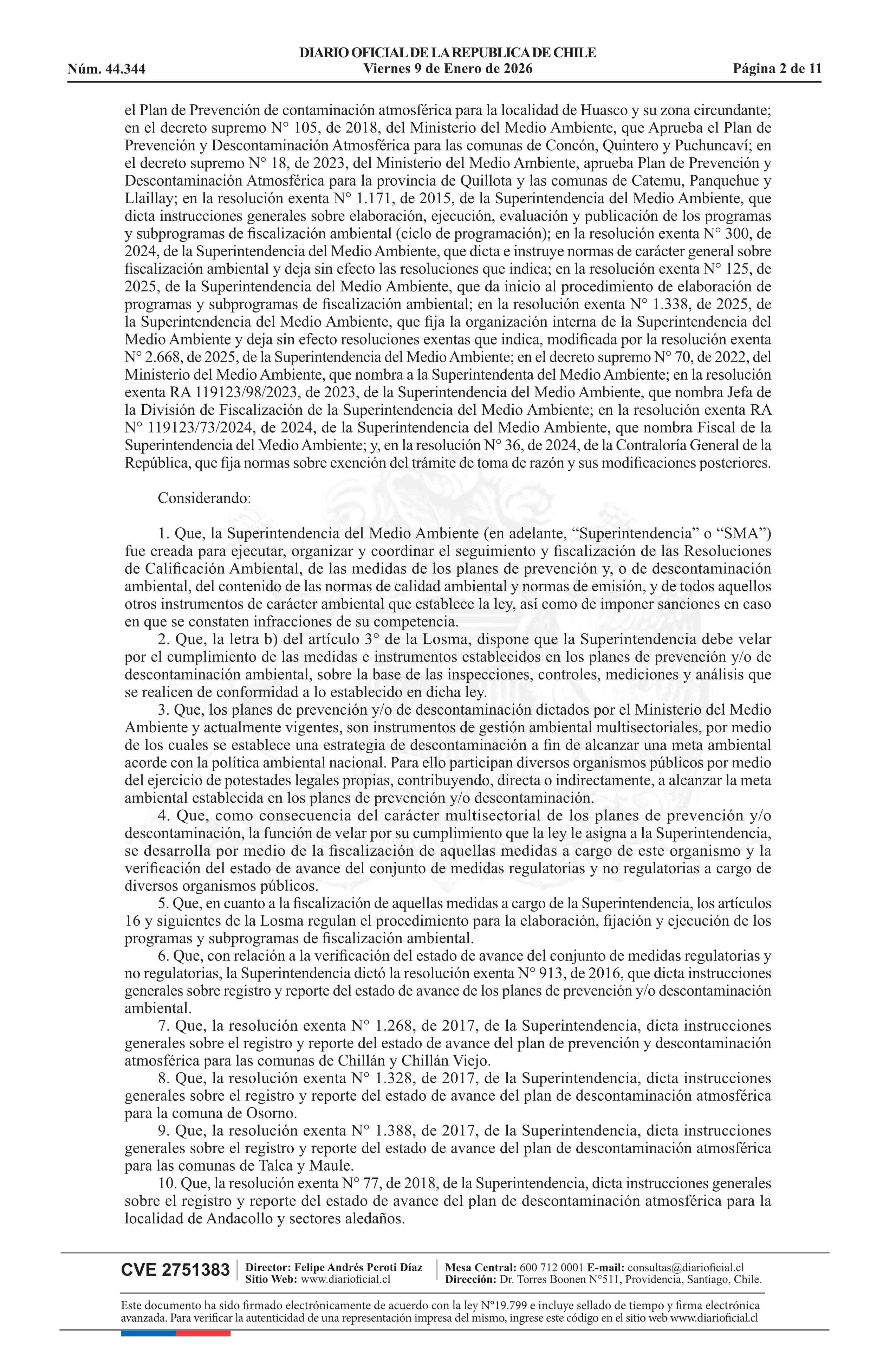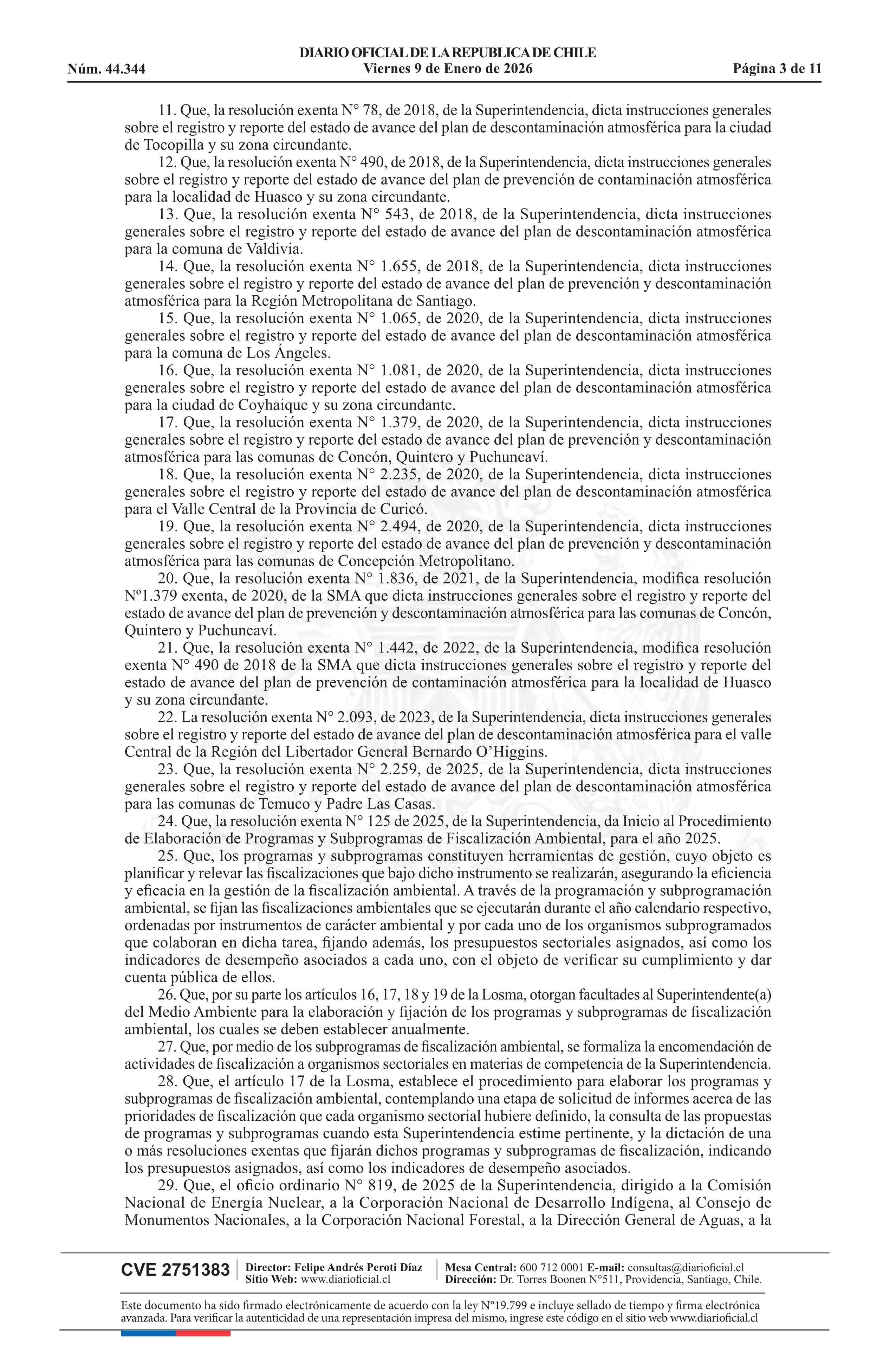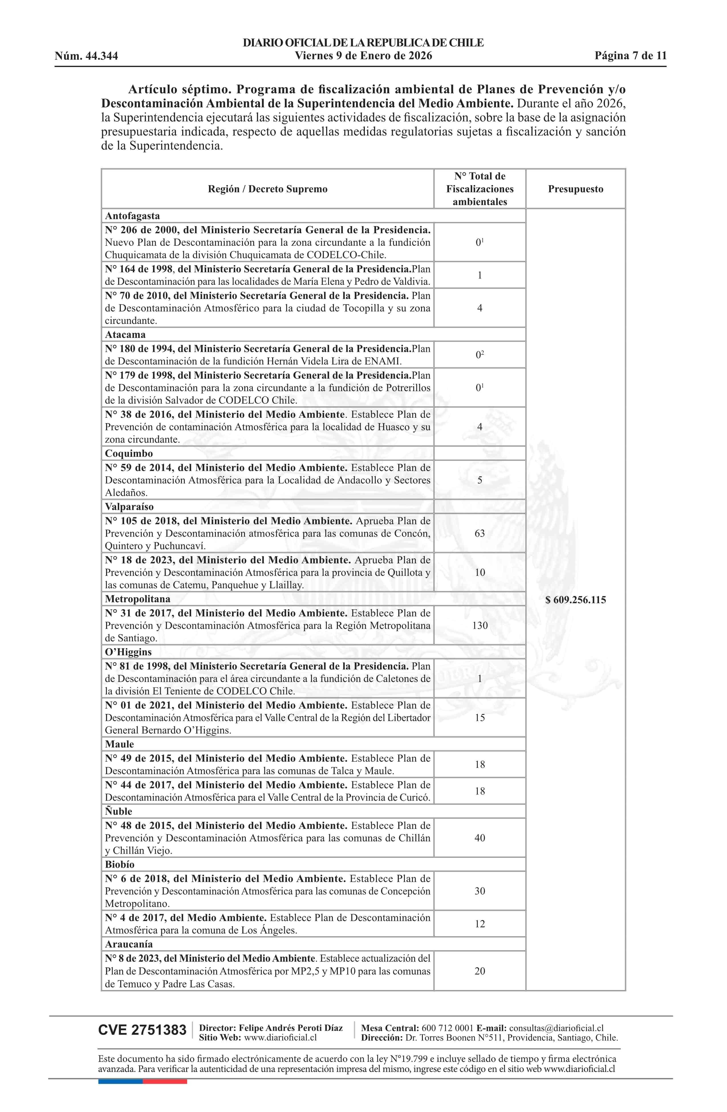 Resolución exenta número 2.998, de 2025.- Fija programa y subprogramas de fiscalización ambiental de planes de prevención y/o descontaminación para el año 2026 09-01-2026 Diario Oficial Edición Electrónica |