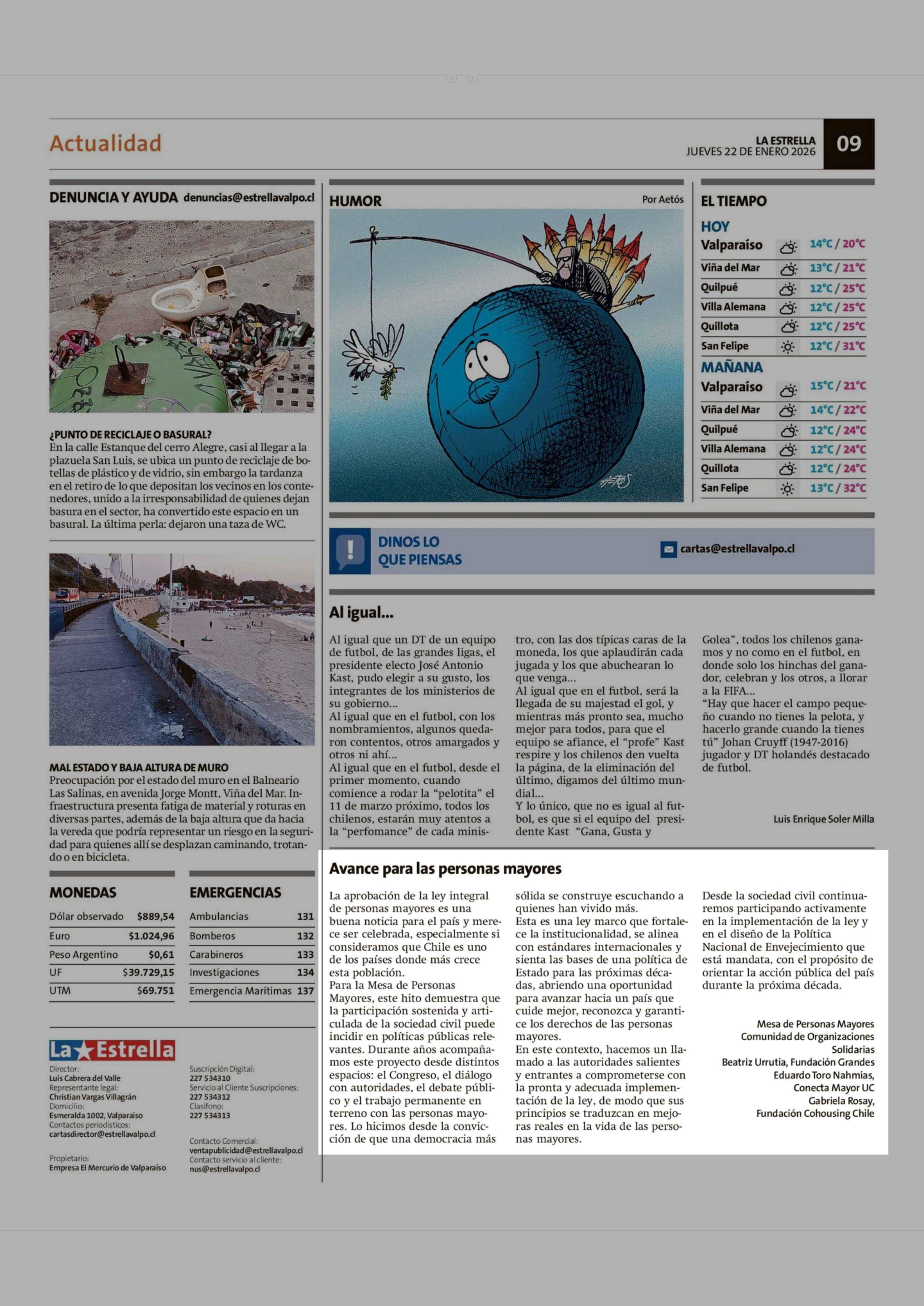 Cartas: Avance para las personas mayores 22-01-2026 La Estrella de Valparaíso |