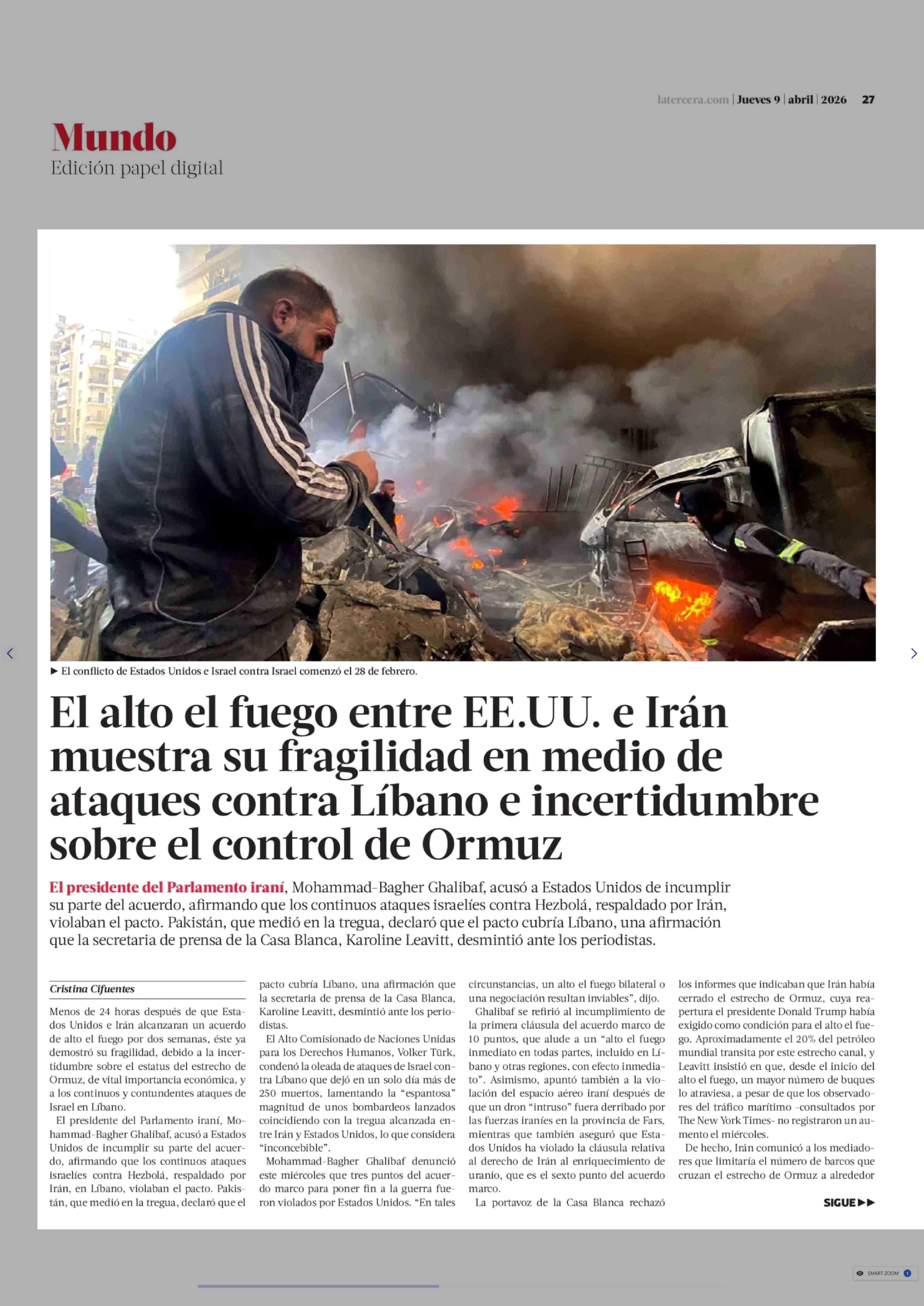| Título: | El alto el fuego entre EE.UU. e Irán muestra su fragilidad en medio de sobre el control de Ormuz ataques contra Líbano e incertidumbre |