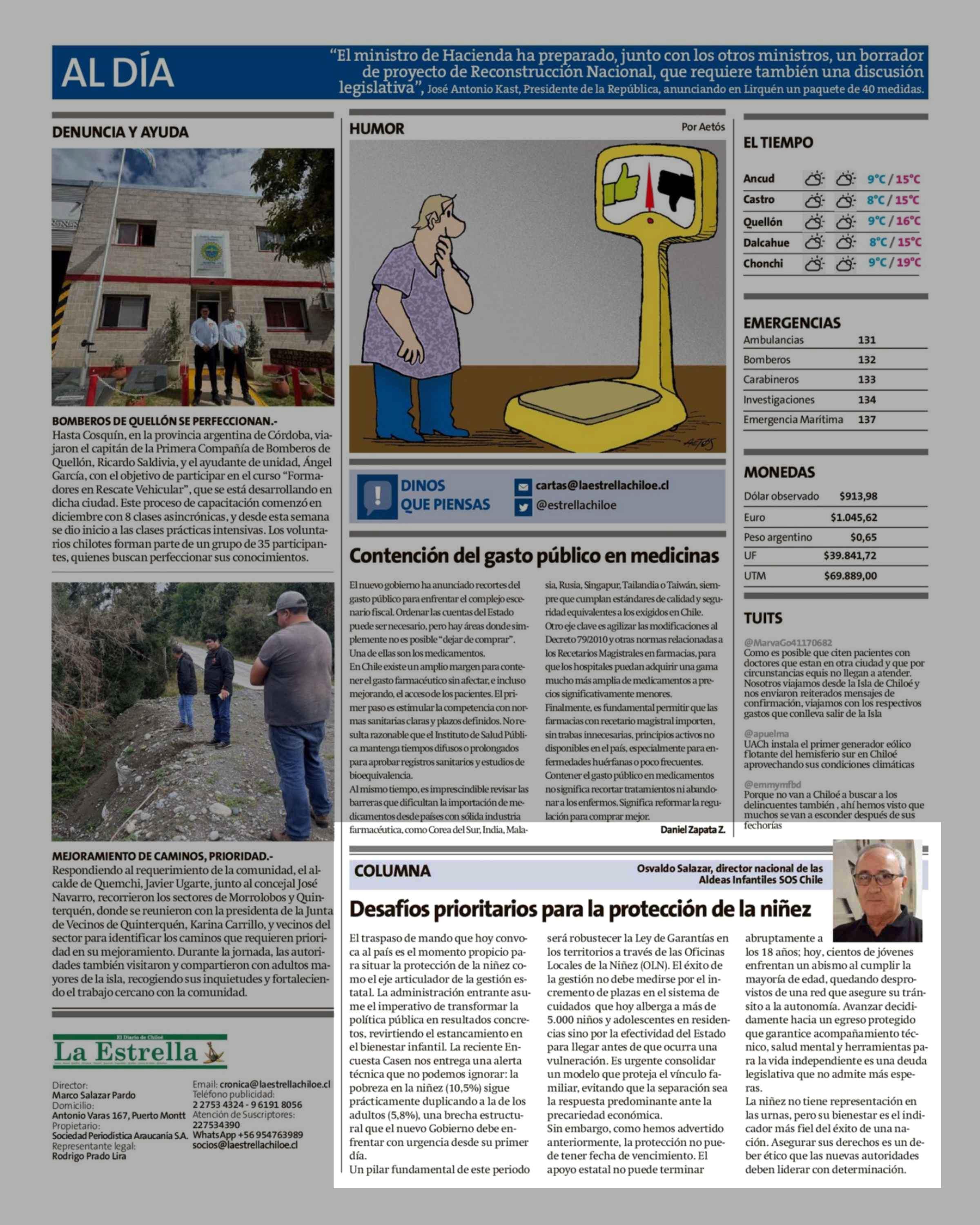 Columnas de Opinión: Desafíos prioritarios para la protección de la niñez 15-03-2026 La Estrella de Chiloé |