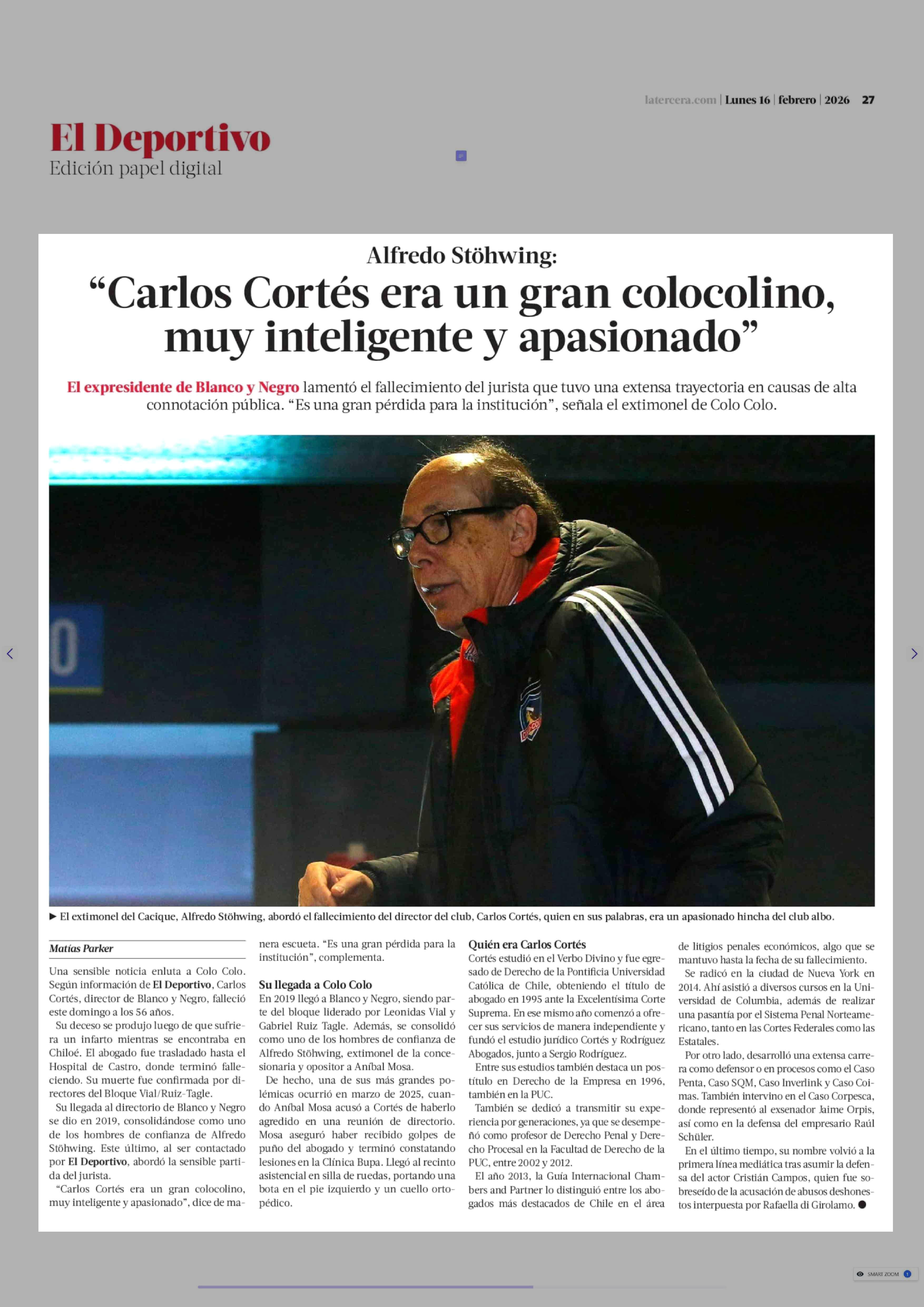 "Carlos Cortés era un gran colocolino, muy inteligente y apasionado" 16-02-2026 La Tercera |