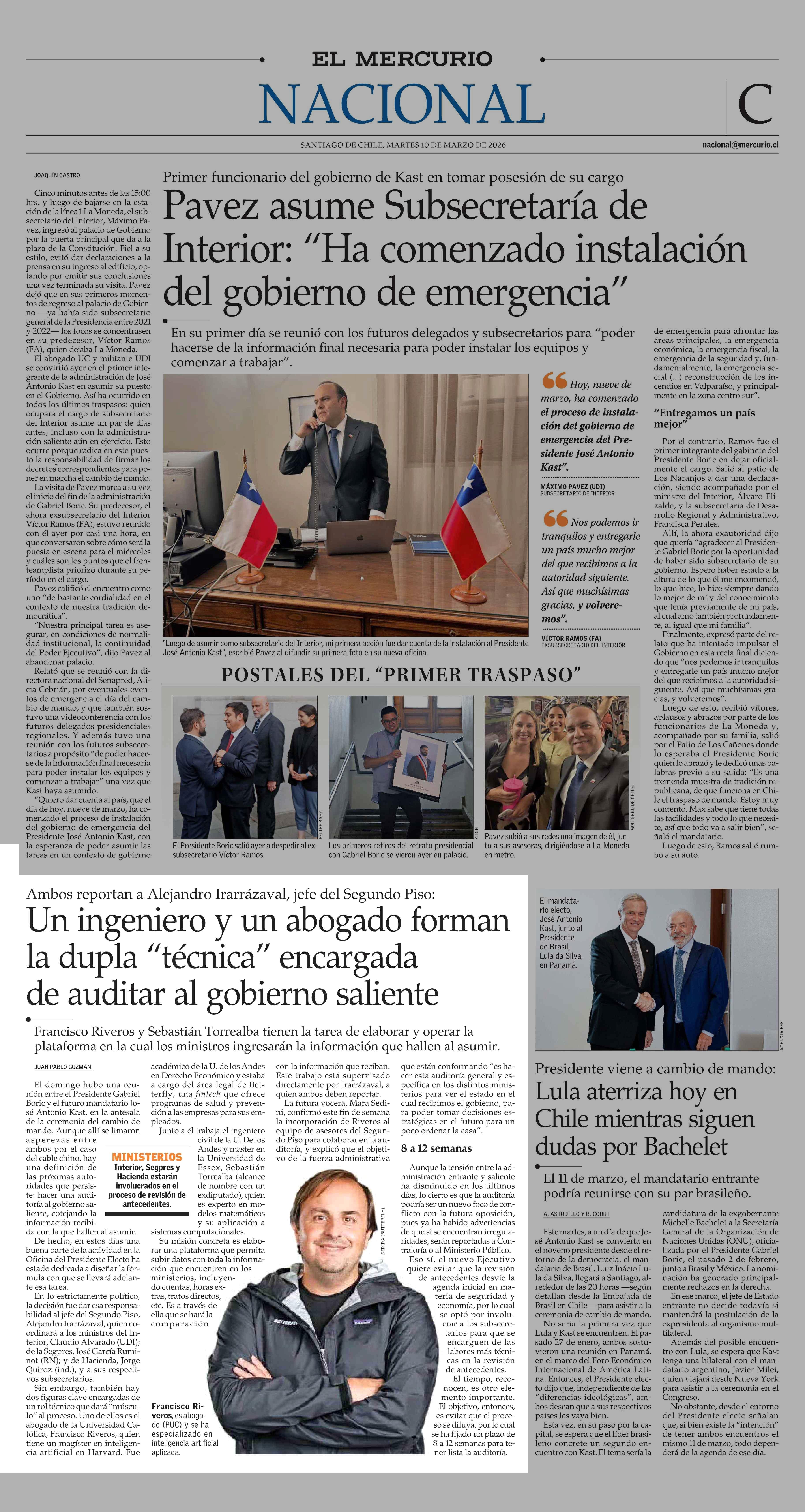 Un ingeniero y un abogado forman la dupla “técnica” encargada de auditar al gobierno saliente 10-03-2026 El Mercurio |