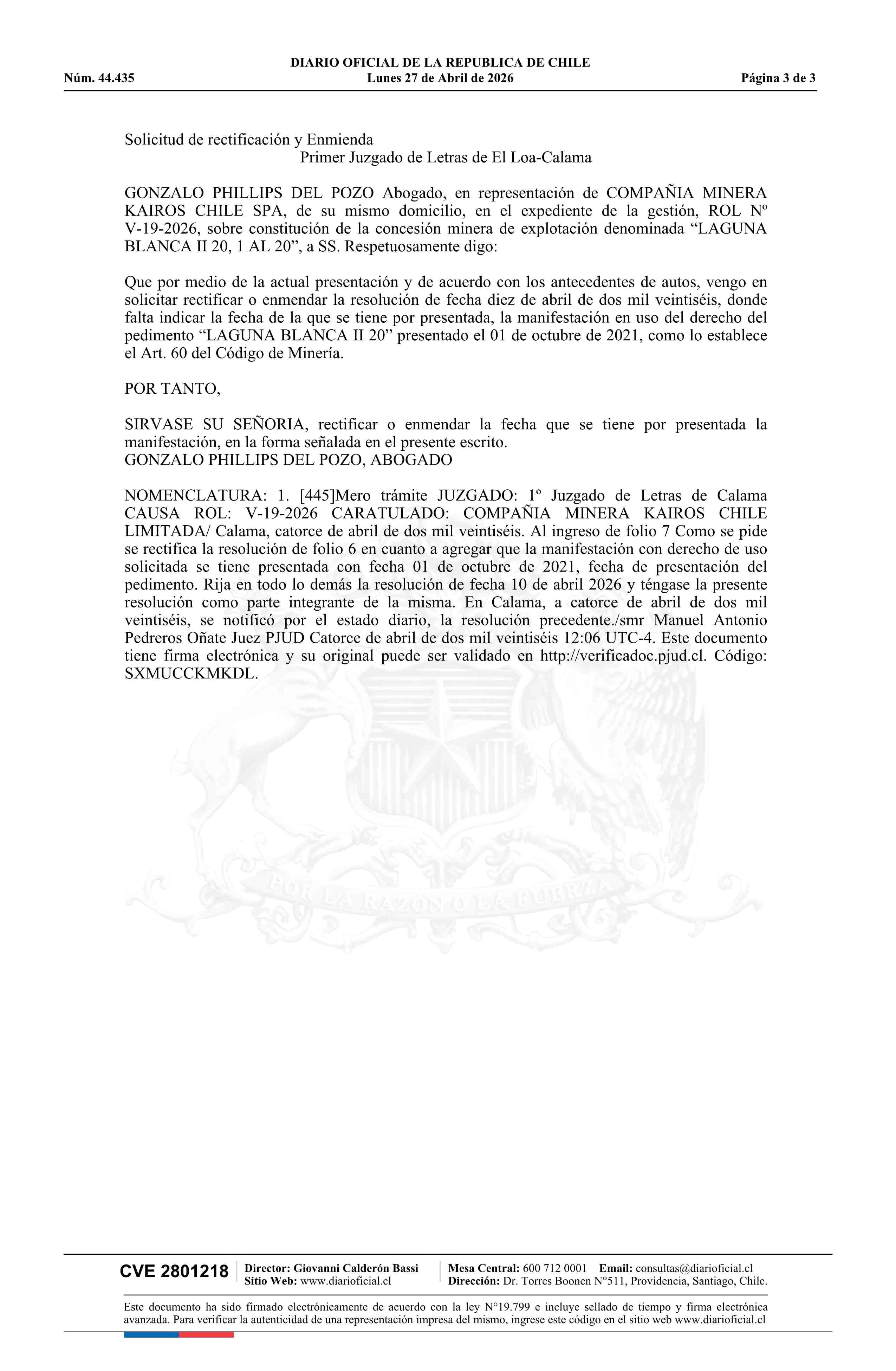 LAGUNA BLANCA II 20, 1 AL 20 / Compañía Minera Kairos Chile Limitada 27-04-2026 DIARIO OFICIAL CHILE - BOLETÍN OFICIAL DE MINERÍA |