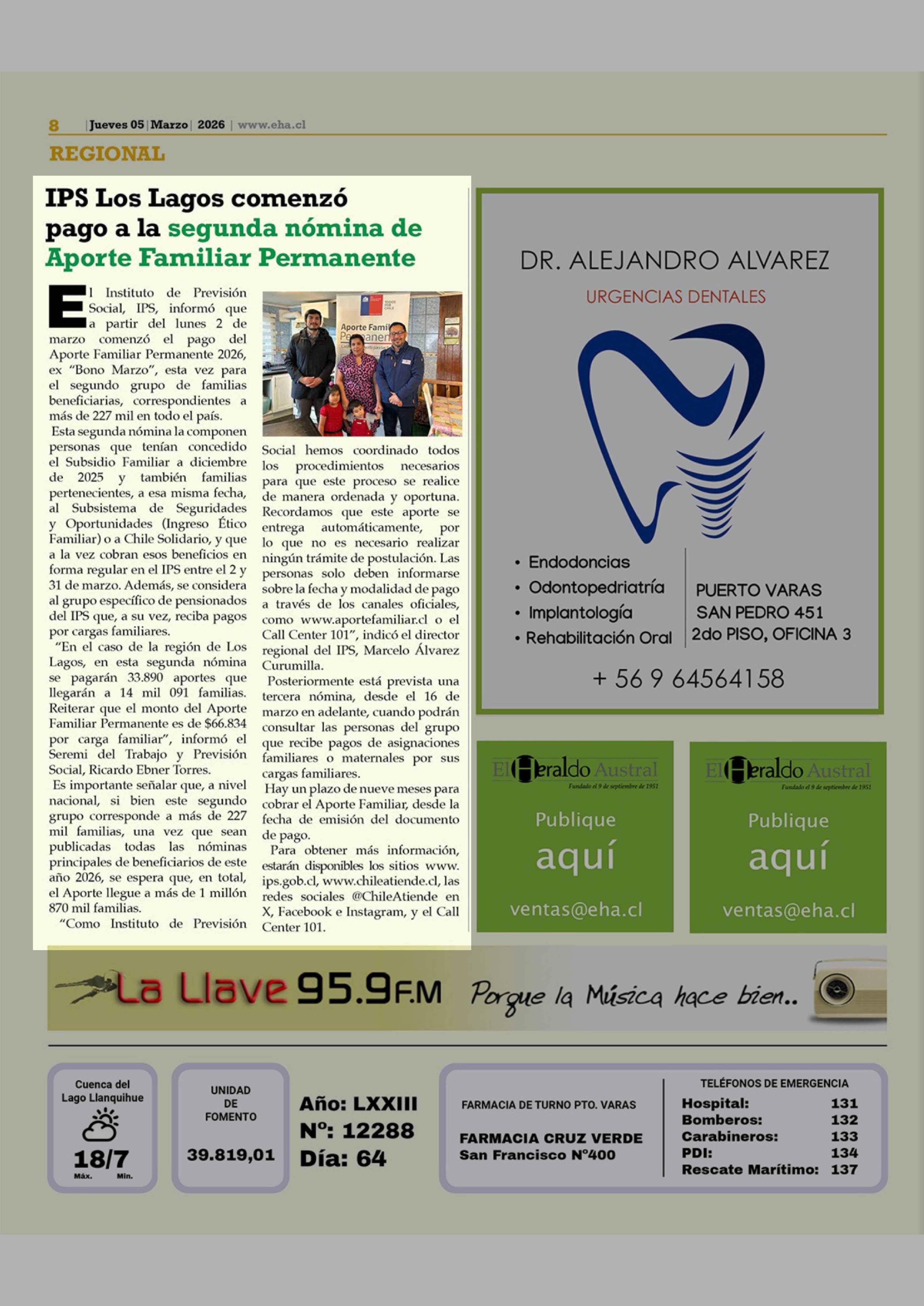 IPS Los Lagos comenzó pago a la segunda nómina de Aporte Familiar Permanente 05-03-2026 El Heraldo Austral |