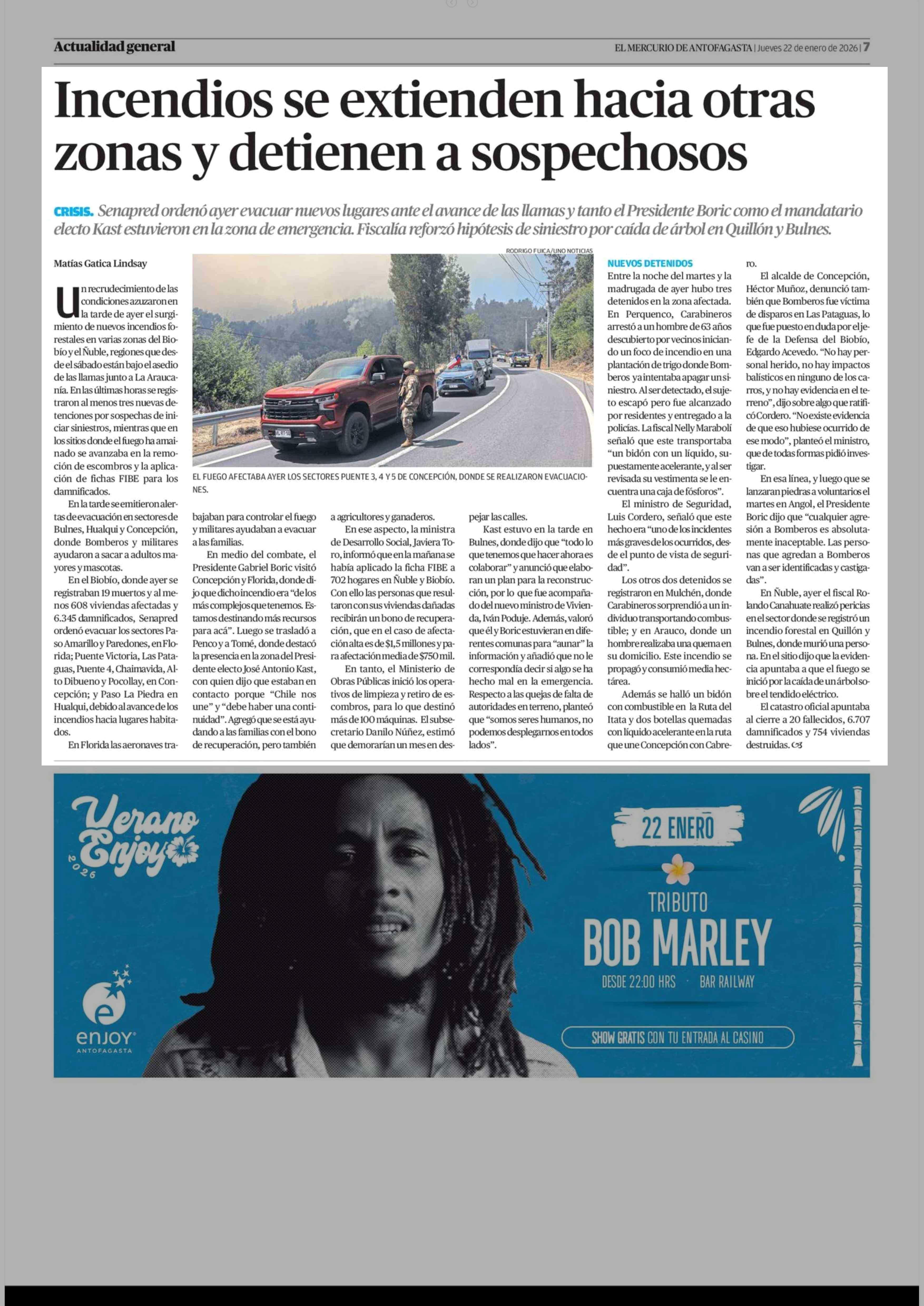 Incendios se extienden hacia otras zonas y detienen a sospechosos 22-01-2026 El Mercurio de Antofagasta |
