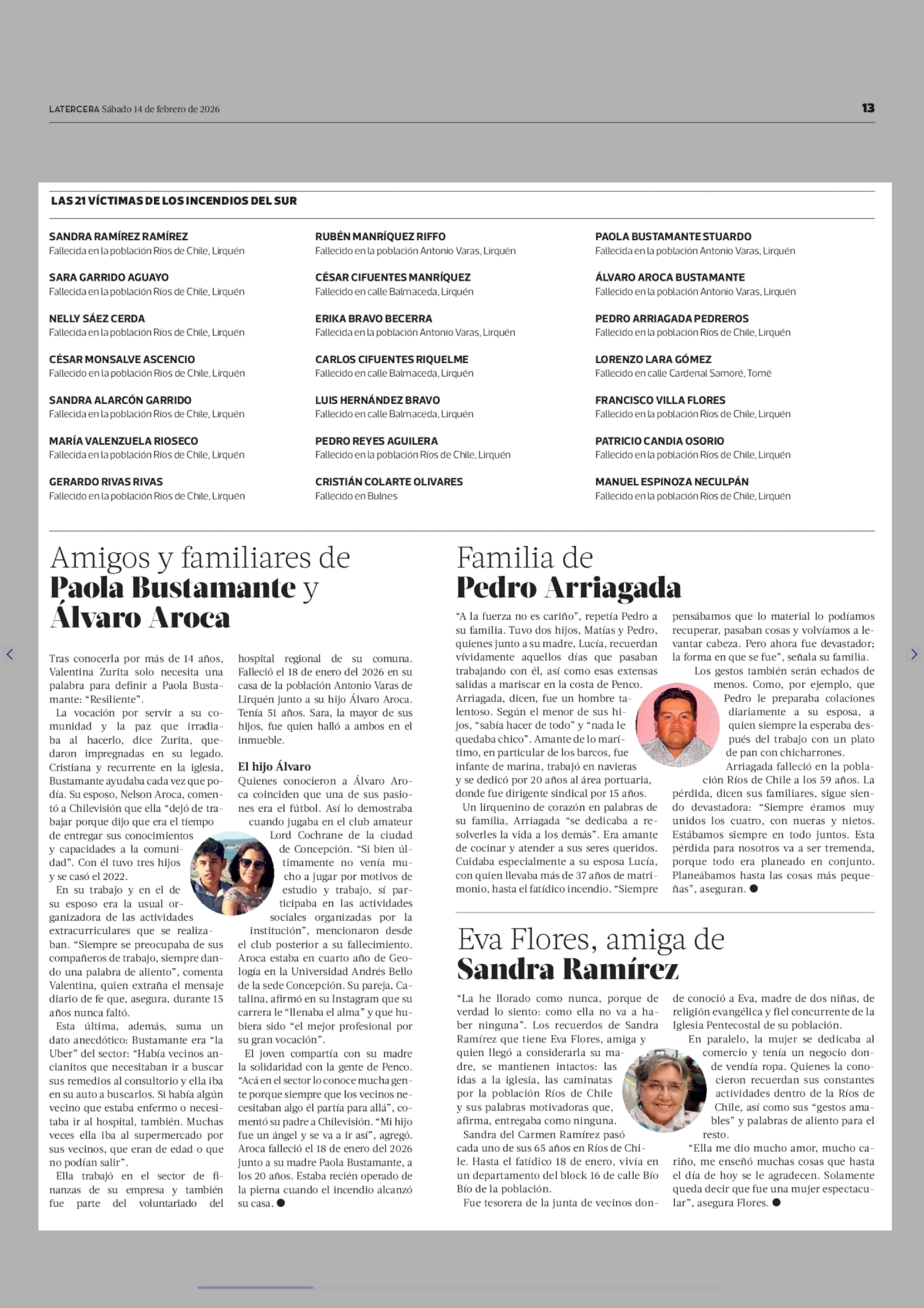 El duelo tras los incendios: cinco relatos de familiares de las 21 víctimas 14-02-2026 La Tercera |