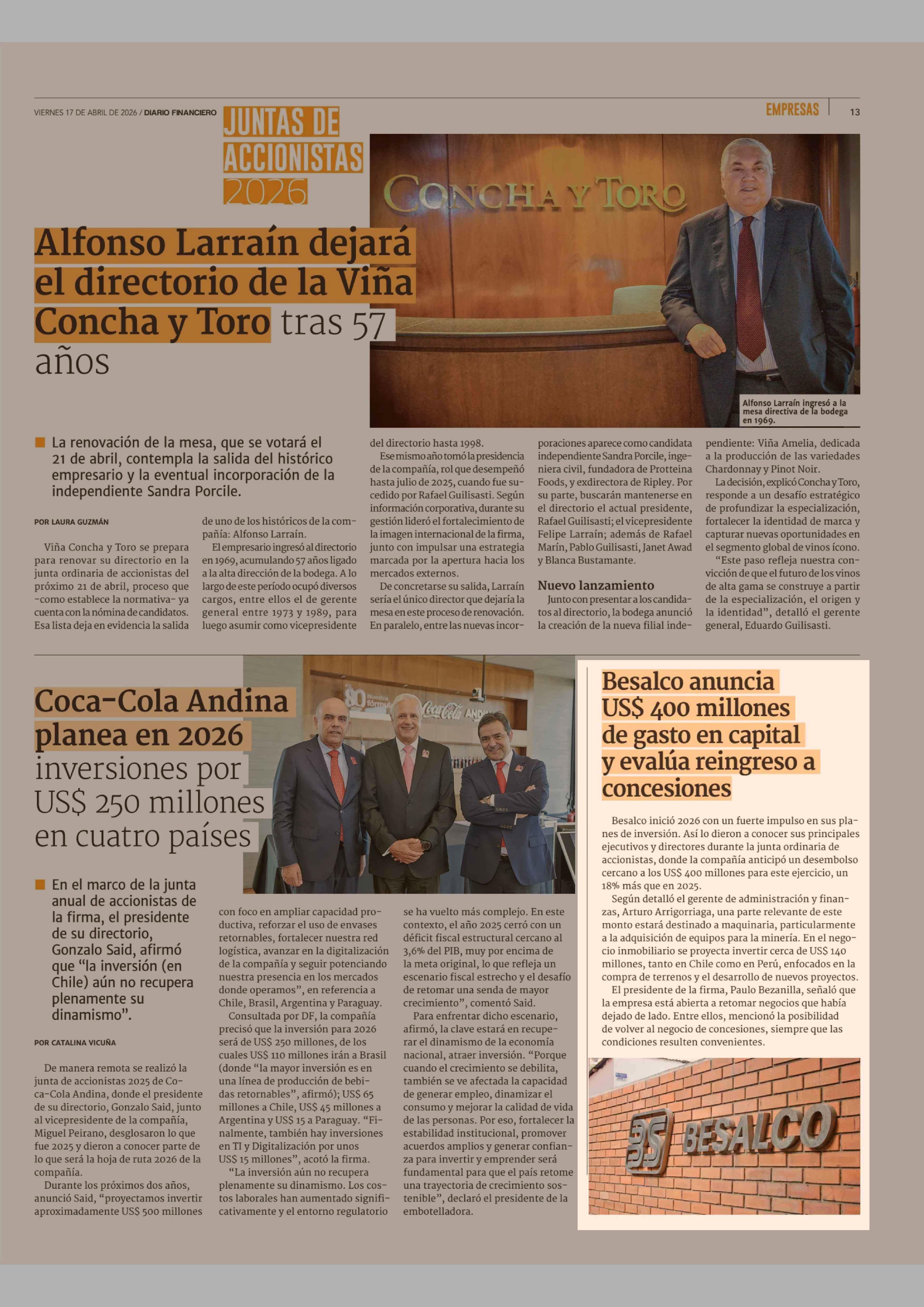 Besalco anuncia US$ 400 millones de gasto en capital y evalúa reingreso a concesiones 17-04-2026 Diario Financiero |