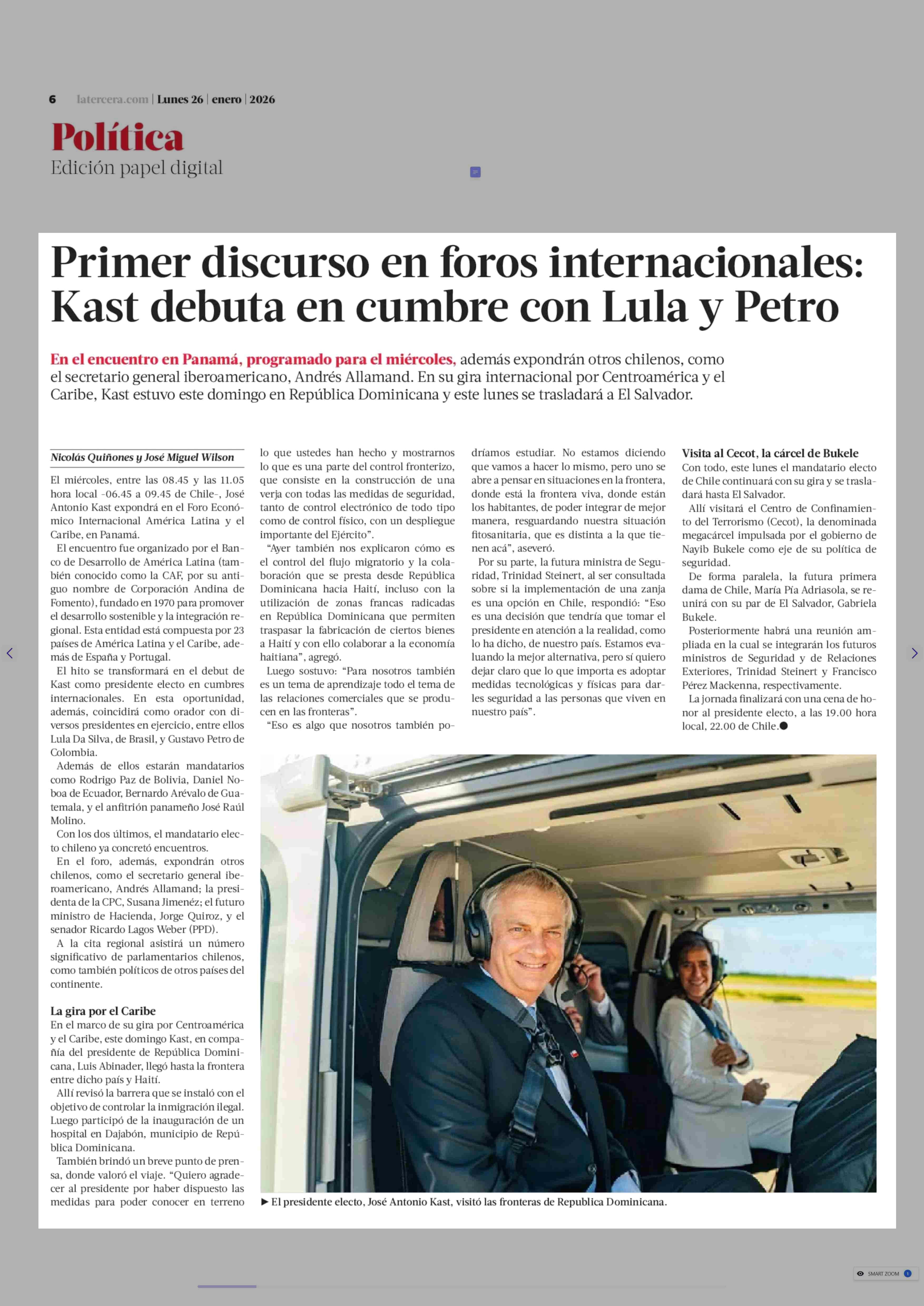 Primer discurso en foros internacionales: Kast debuta en cumbre con Lula y Petro 26-01-2026 La Tercera |