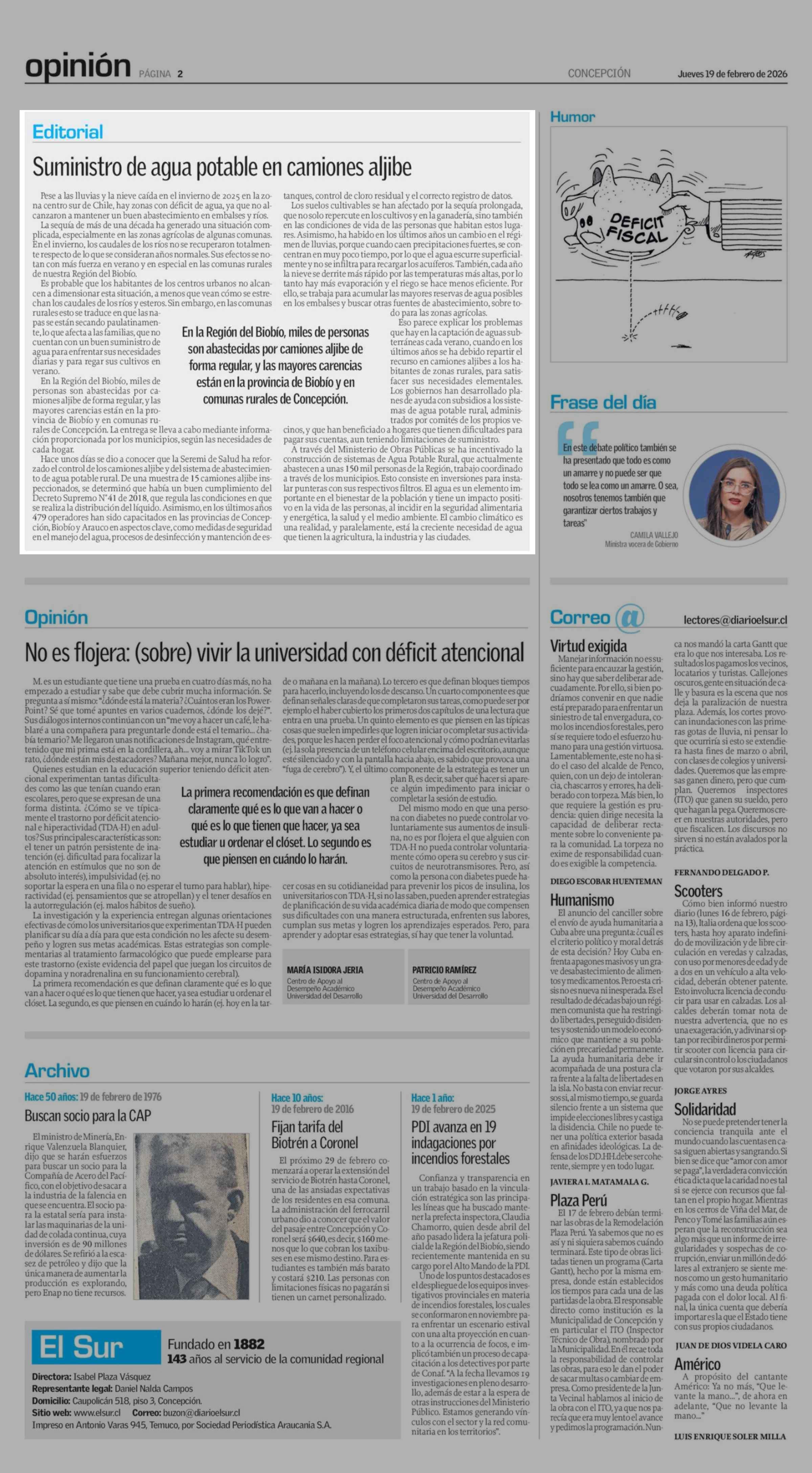 Editorial: Suministro de agua potable en camiones aljibe 19-02-2026 El Sur |