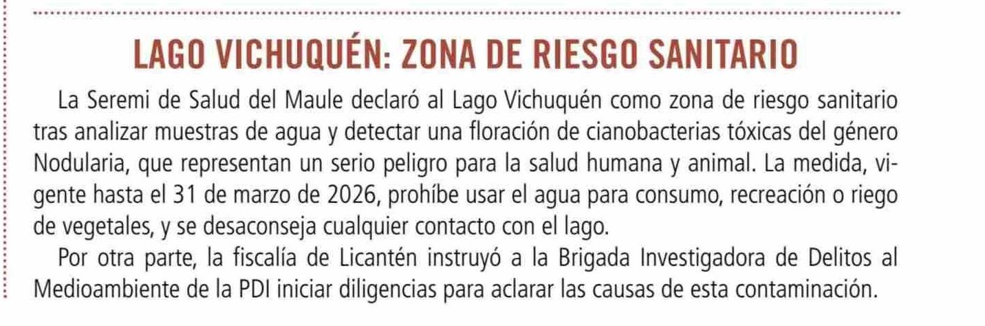 LAGO VICHUQUÉN: ZONA DE RIESGO SANITARIO 08-01-2026 Revista Induambiente |