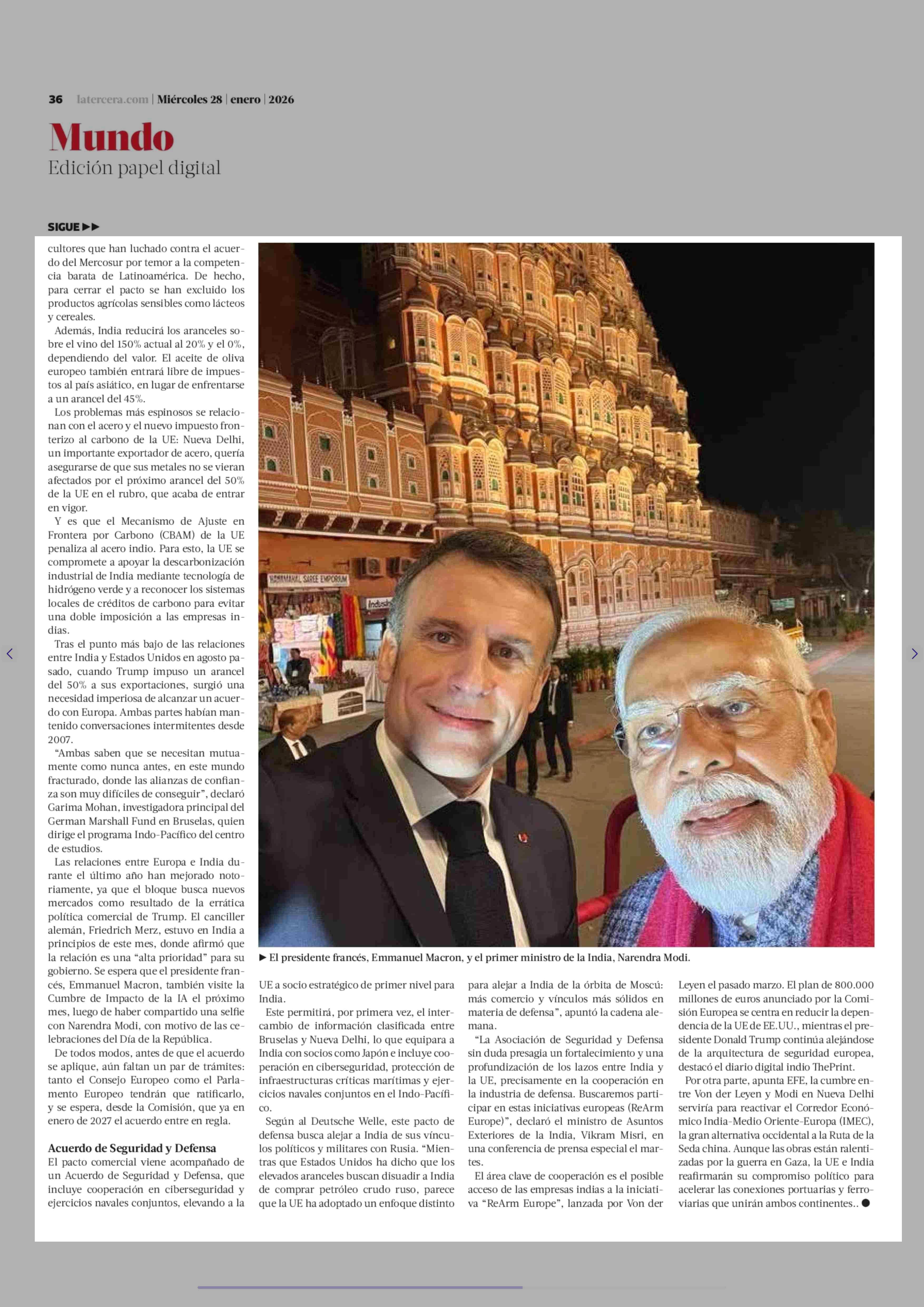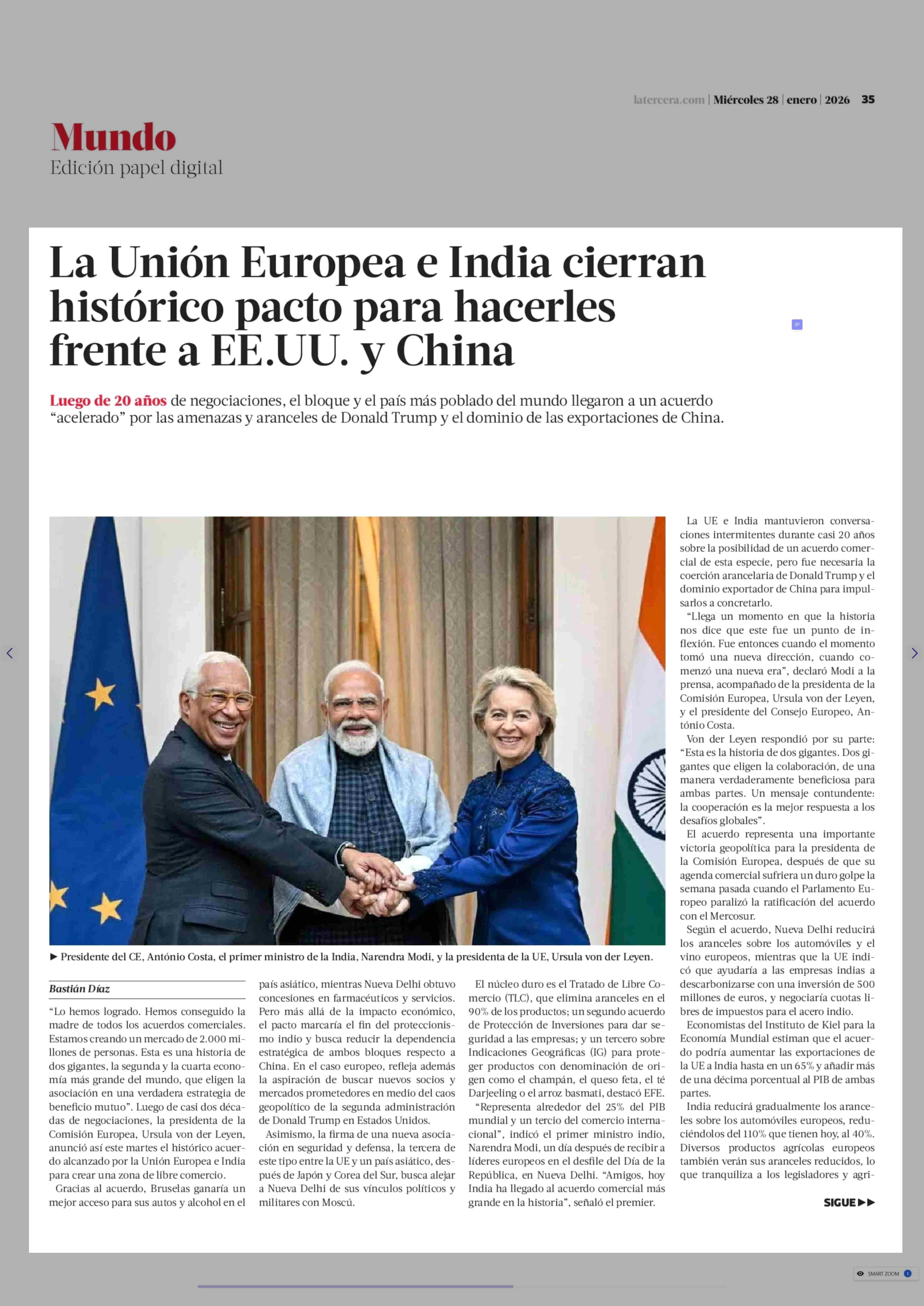 La Unión Europea e India cierran histórico pacto para hacerles frente a EE.UU. y China 28-01-2026 La Tercera |