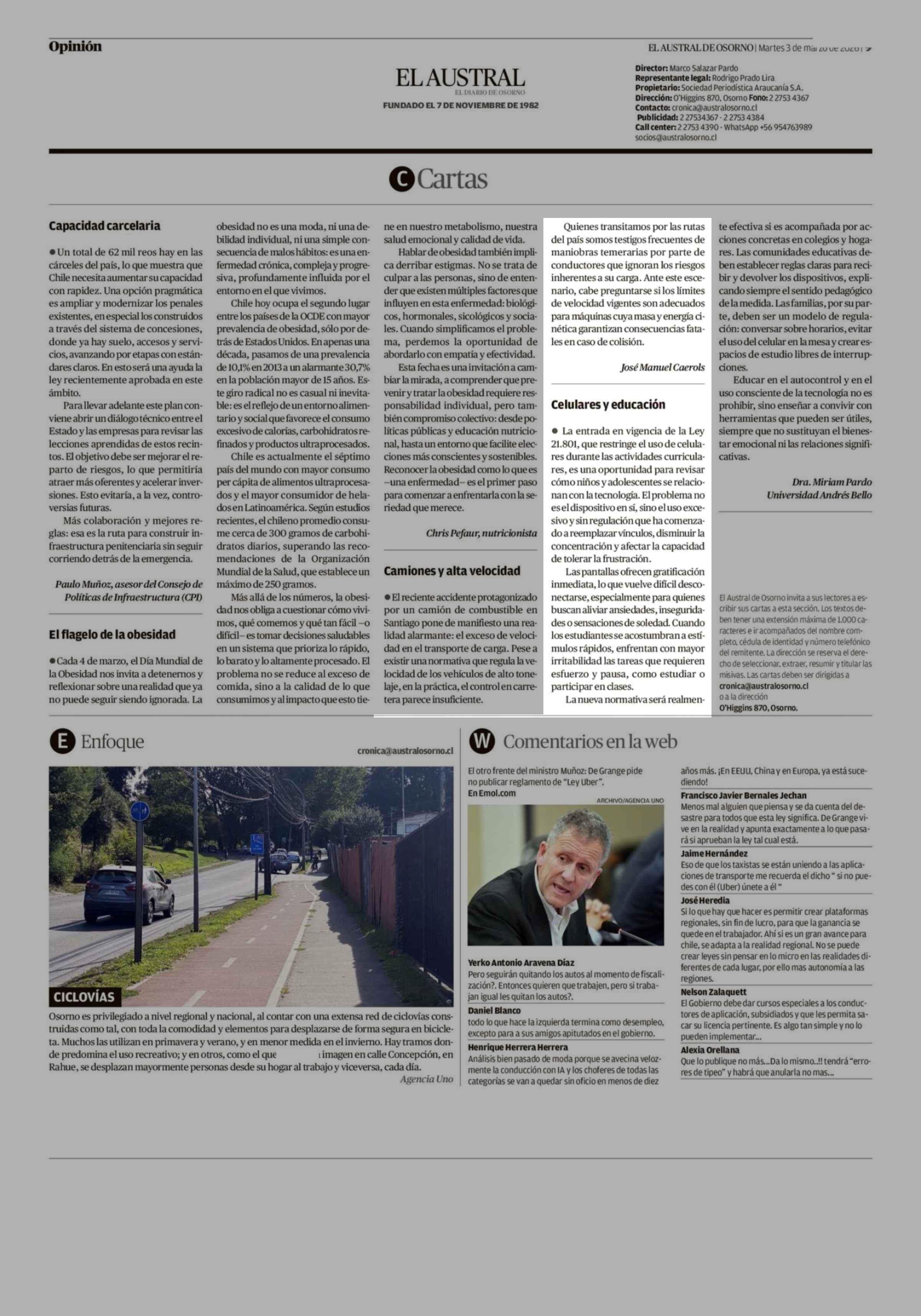 CARTAS: Camiones y alta velocidad 03-03-2026 El Austral de Osorno |
