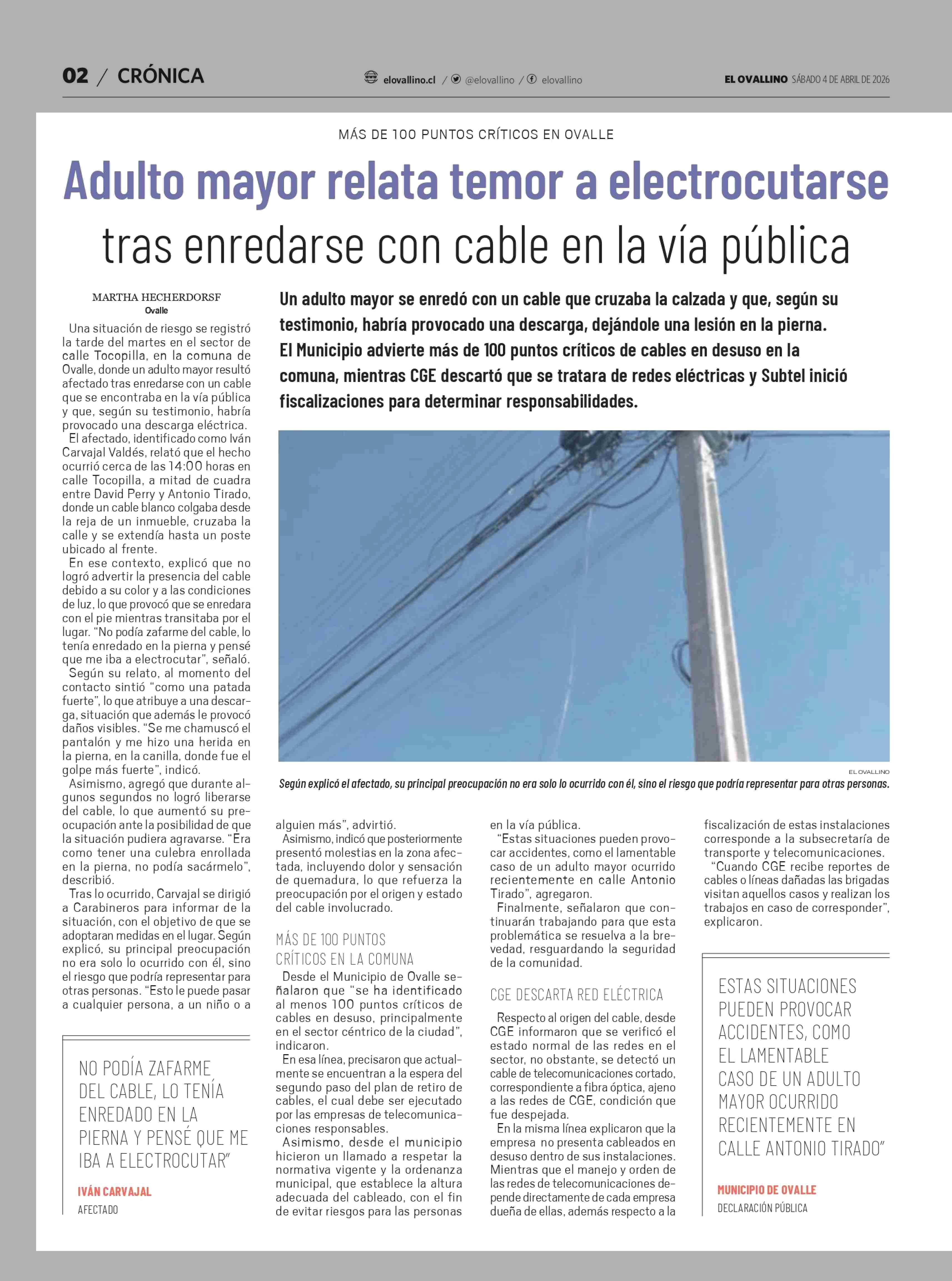 Título: Adulto mayor relata temor a electrocutarse tras enredarse con cable en la vía pública
