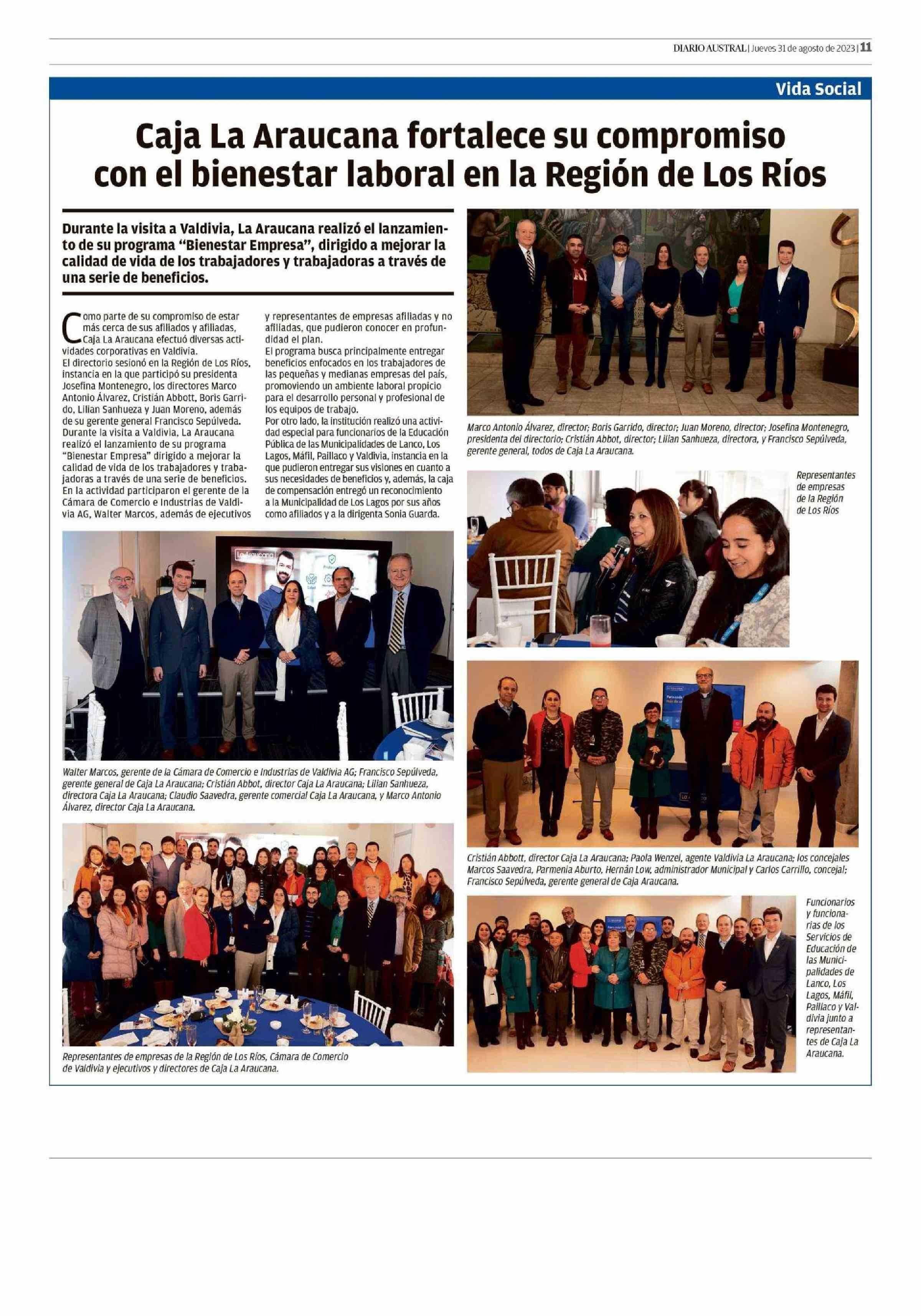 Caja La Araucana fortalece su compromiso con el bienestar laboral en la Región de Los Ríos 31-08-2023 Diario Austral Región de Los Ríos |