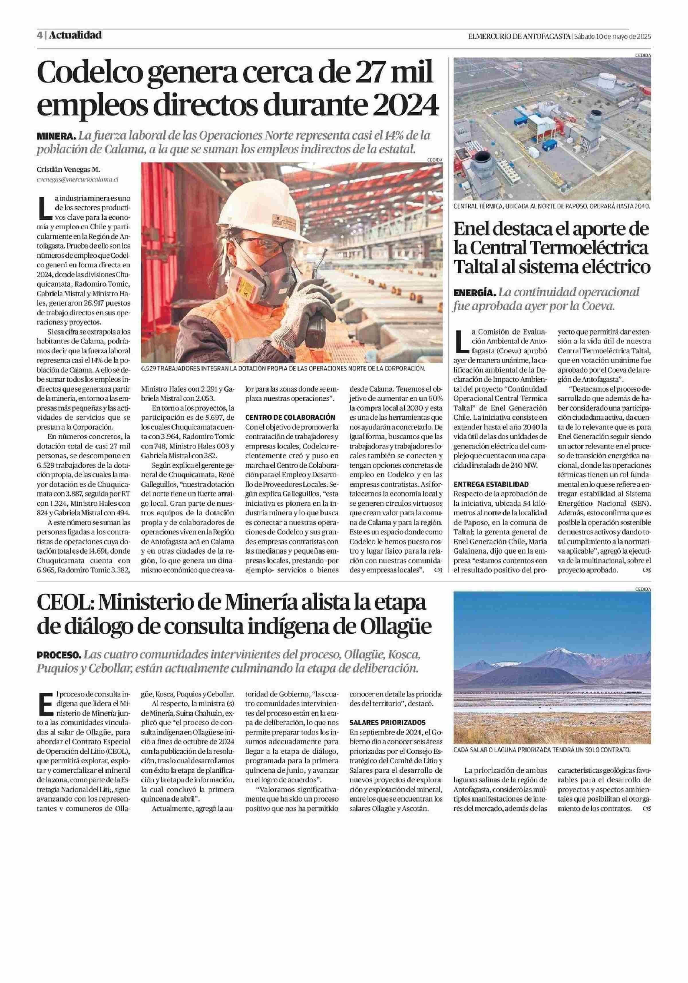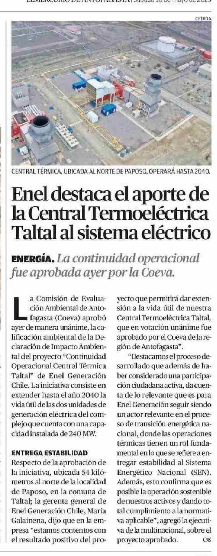 Enel destaca el aporte de Taltal al sistema eléctrico la Central Termoeléctrica 10-05-2025 El Mercurio de Antofagasta |