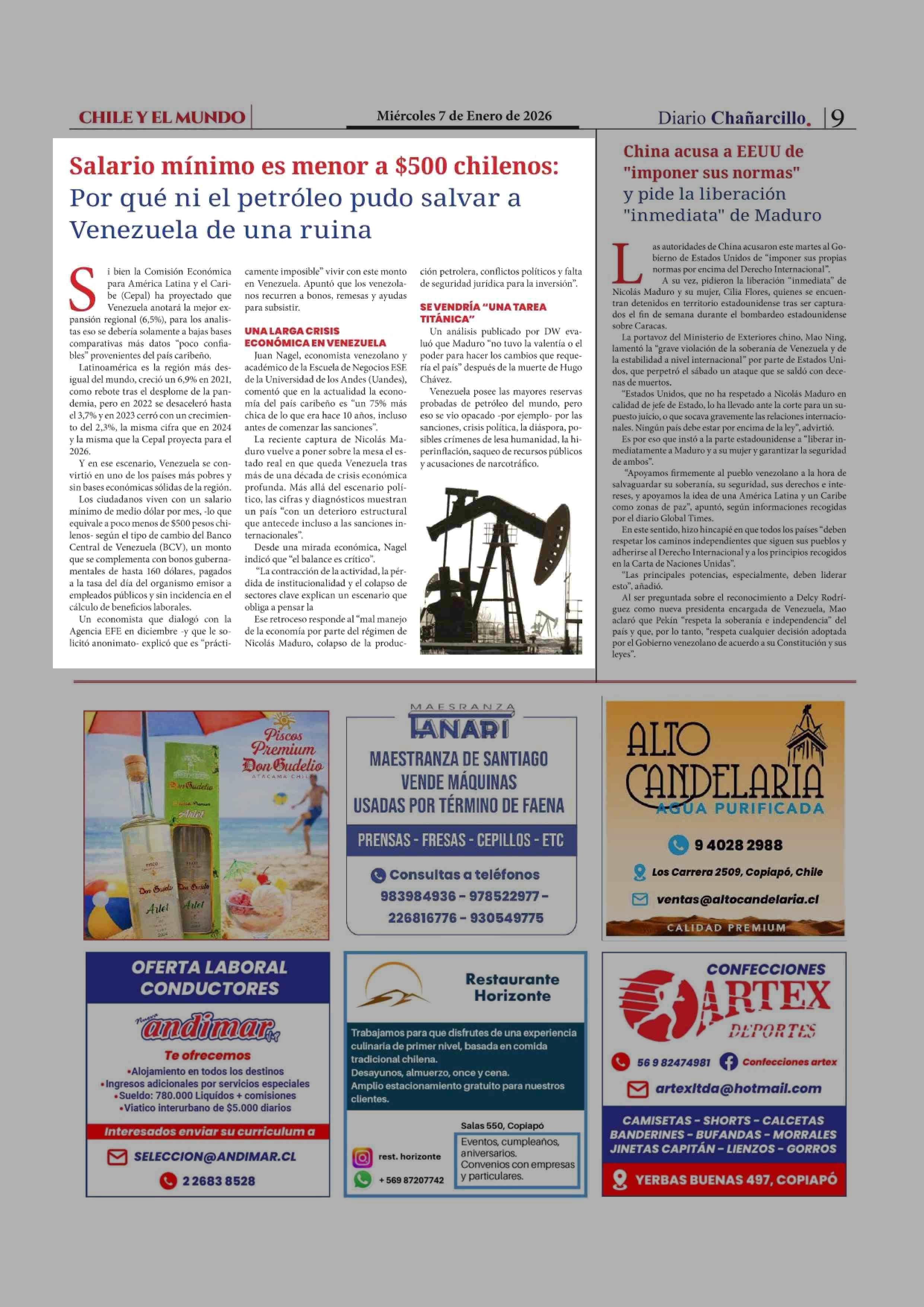 Salario mínimo es menor a $500 chilenos: Por qué ni el petróleo pudo salvar a Venezuela de una ruina 07-01-2026 Diario Chañarcillo |