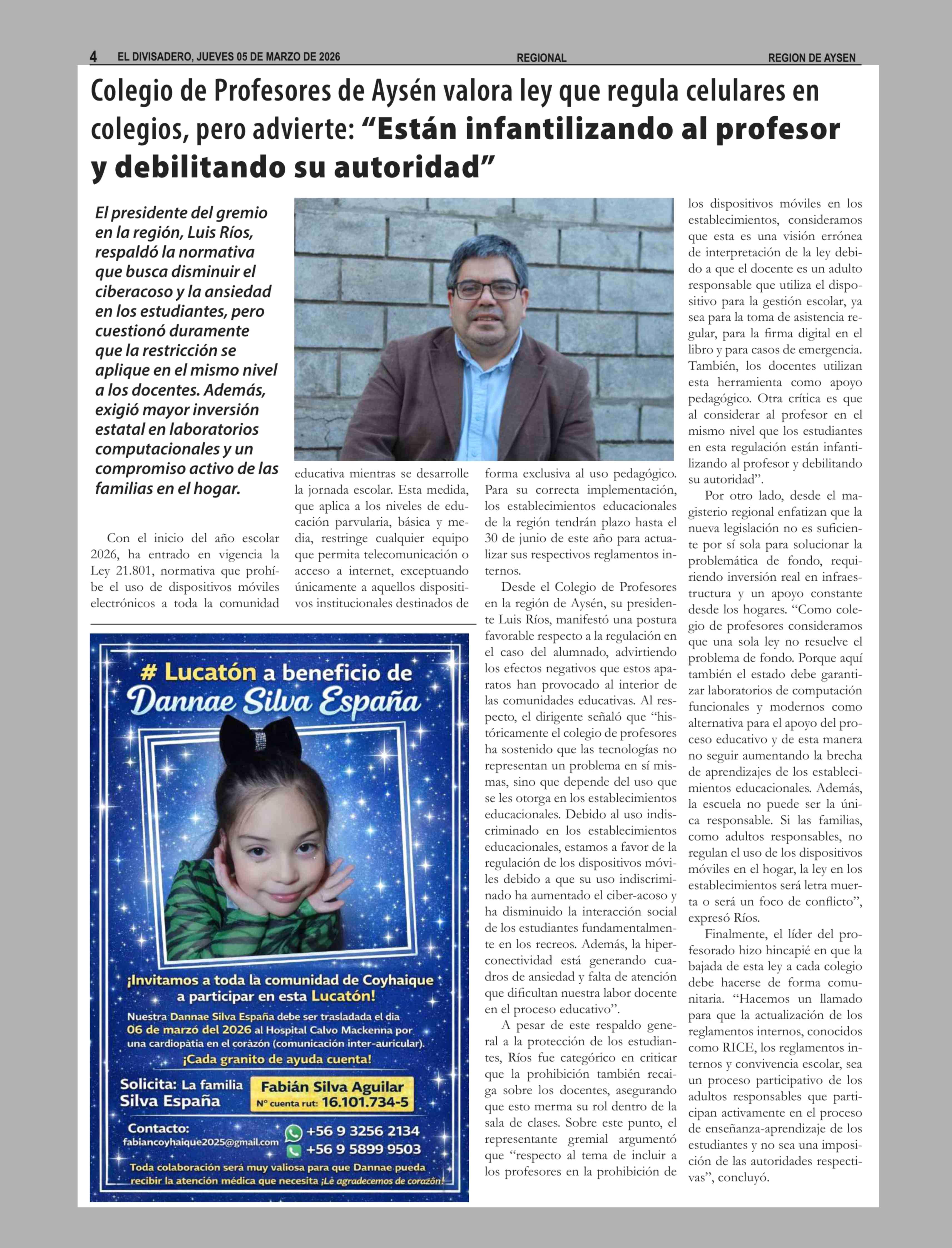 Colegio de Profesores de Aysén valora ley que regula celulares en colegios, pero advierte: "Están infantilizando al profesor y debilitando su autoridad" 05-03-2026 El Divisadero |