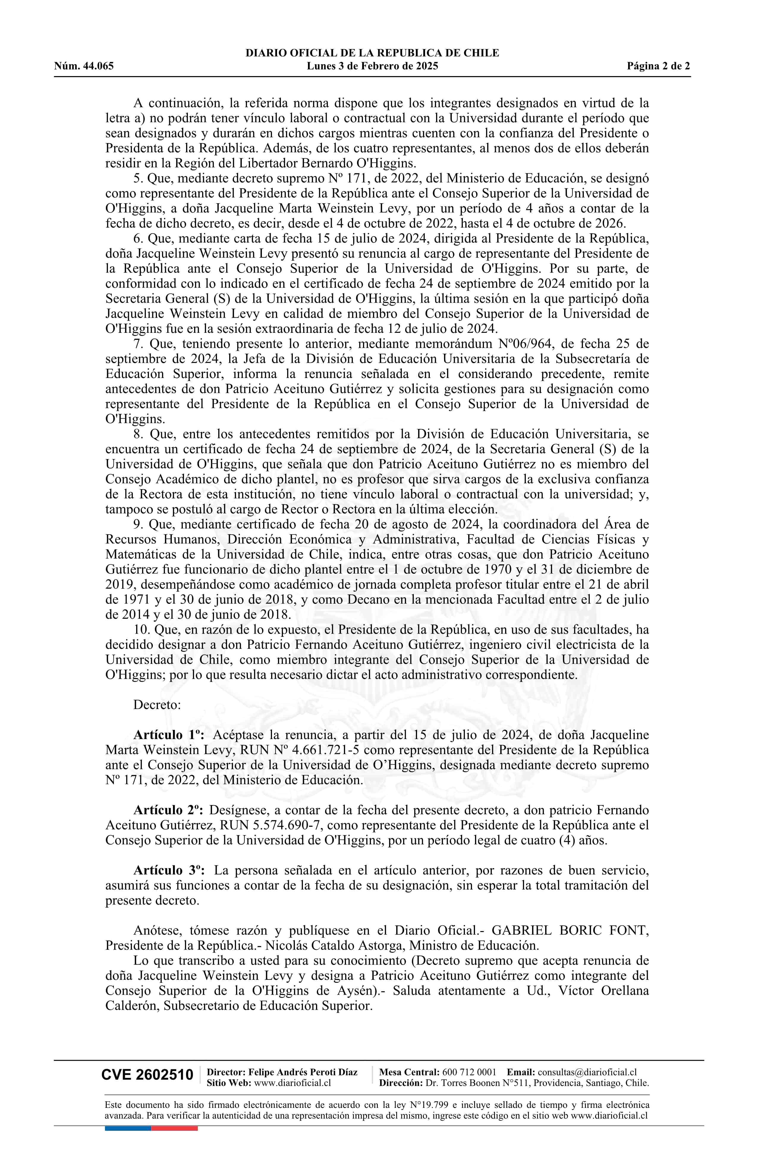 | Título: | Decreto número 132, de 2024.- Acepta renuncia de doña Jacqueline Weinstein Levy y designa a don Patricio Aceituno Gutiérrez como integrante del Consejo Superior de la Universidad de O'Higgins |