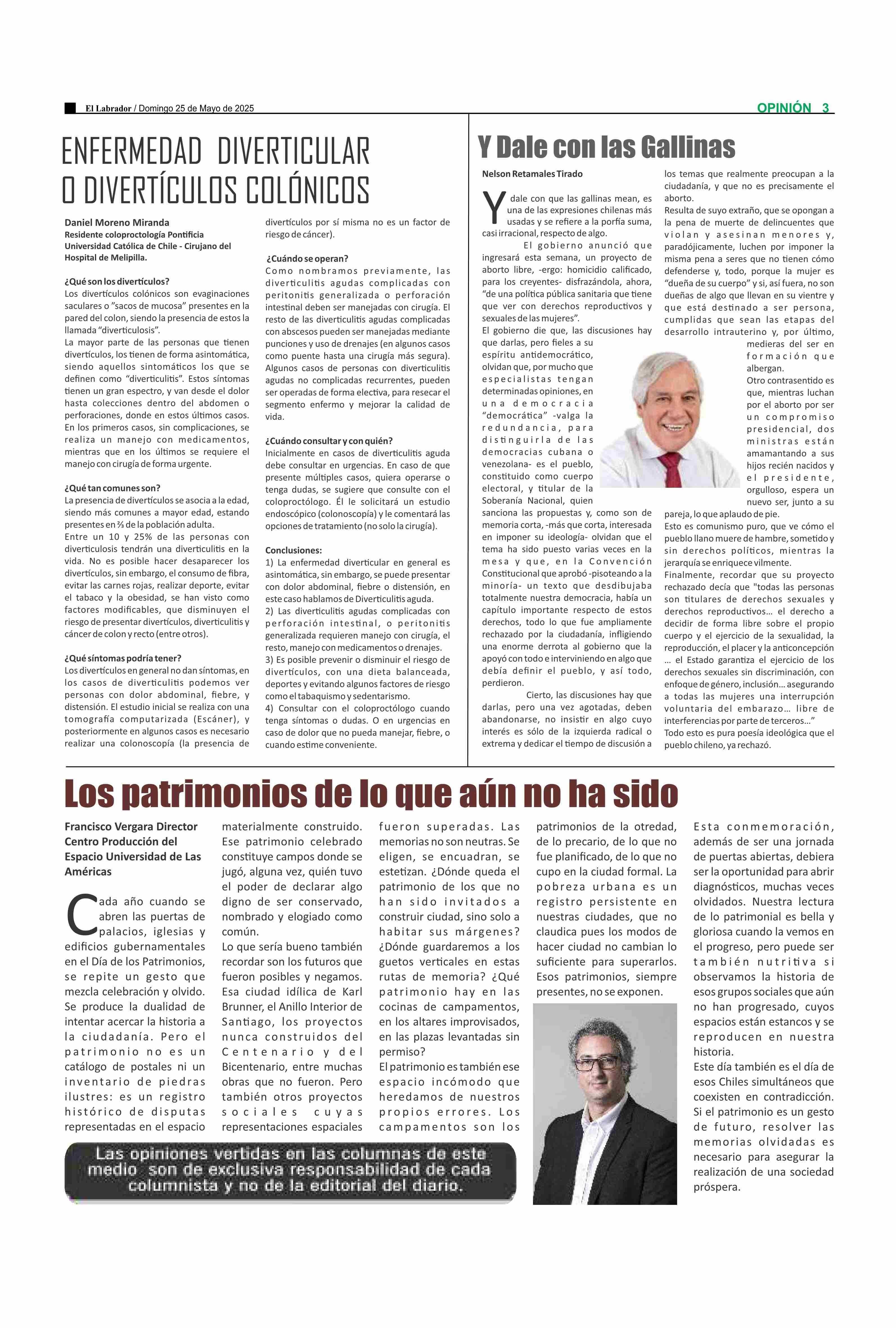 COLUMNAS DE OPINIÓN: ENFERMEDAD DIVERTICULAR O DIVERTÍCULOS COLÓNICOS 25-05-2025 El Labrador |