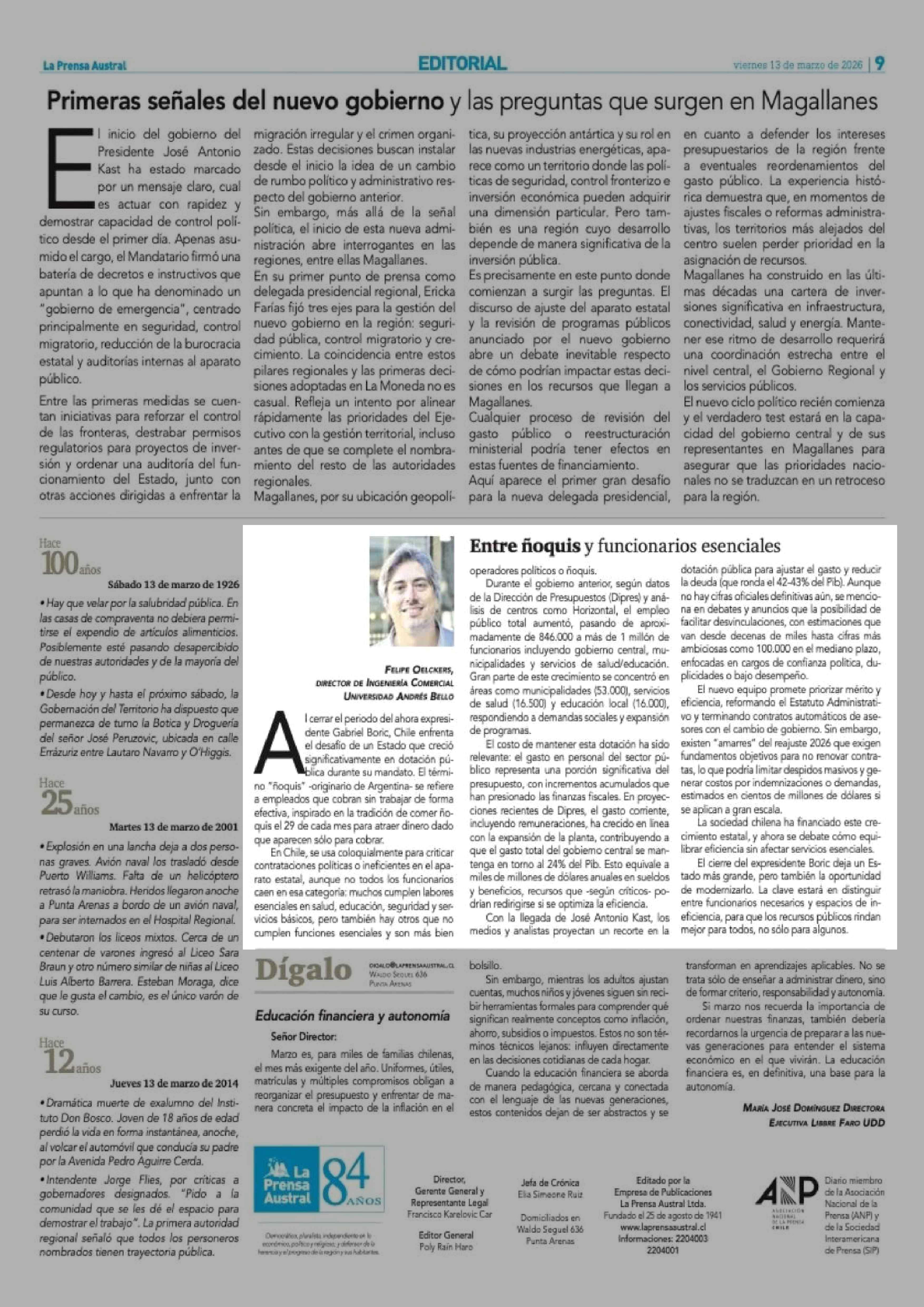 Columnas de Opinión: Entre ñoquis y funcionarios esenciales 13-03-2026 La Prensa Austral |