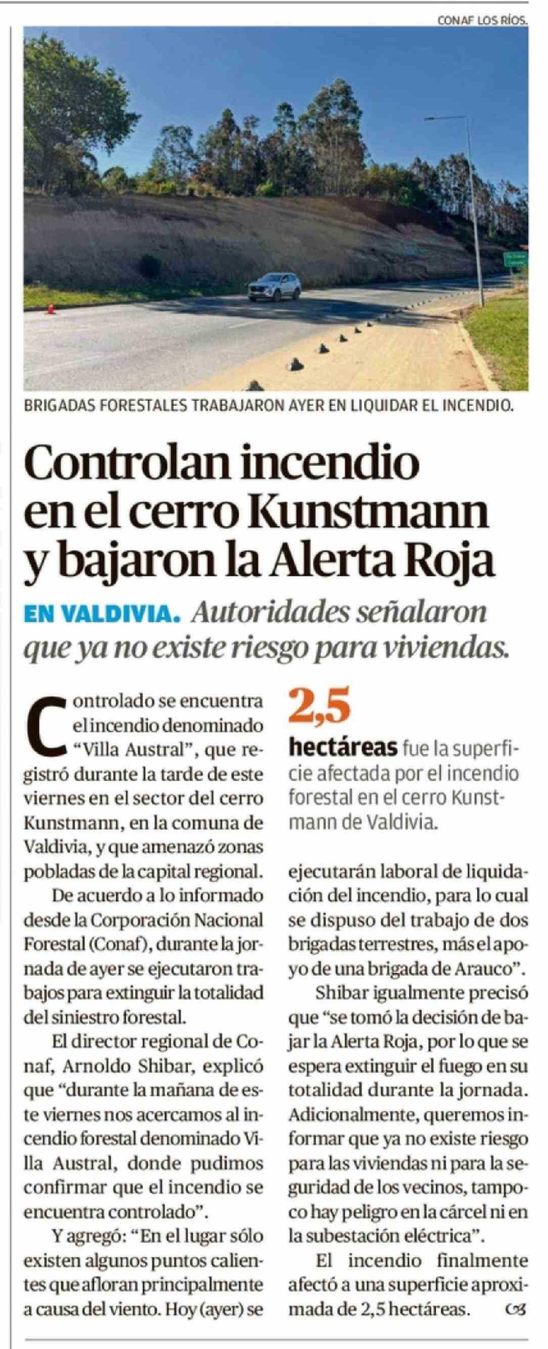 Controlan incendio en el cerro Kunstmann y bajaron la Alerta Roja 21-02-2026 Diario Austral Región de Los Ríos |