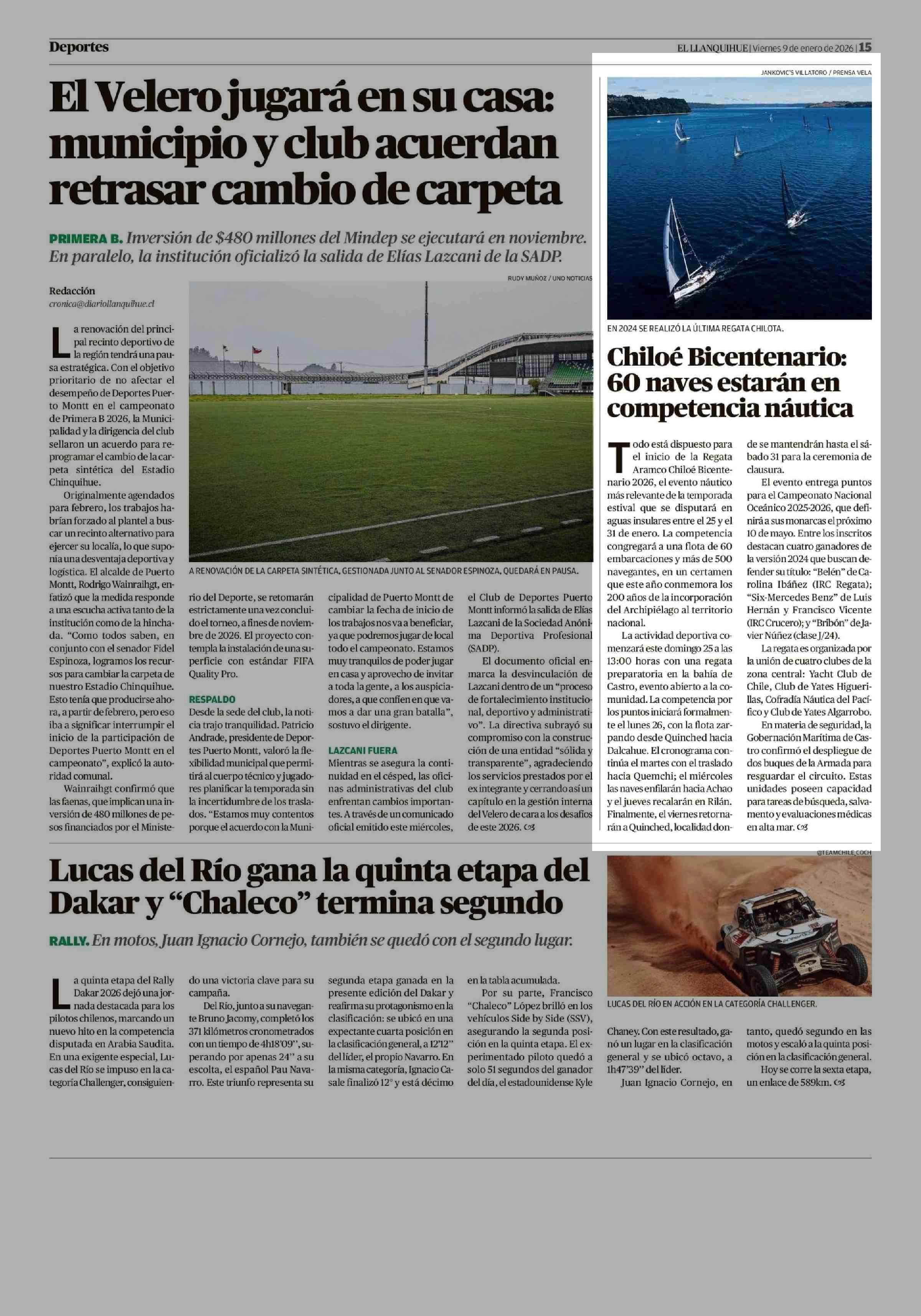 Chiloé Bicentenario: 60 naves estarán en competencia náutica 09-01-2026 El Llanquihue |
