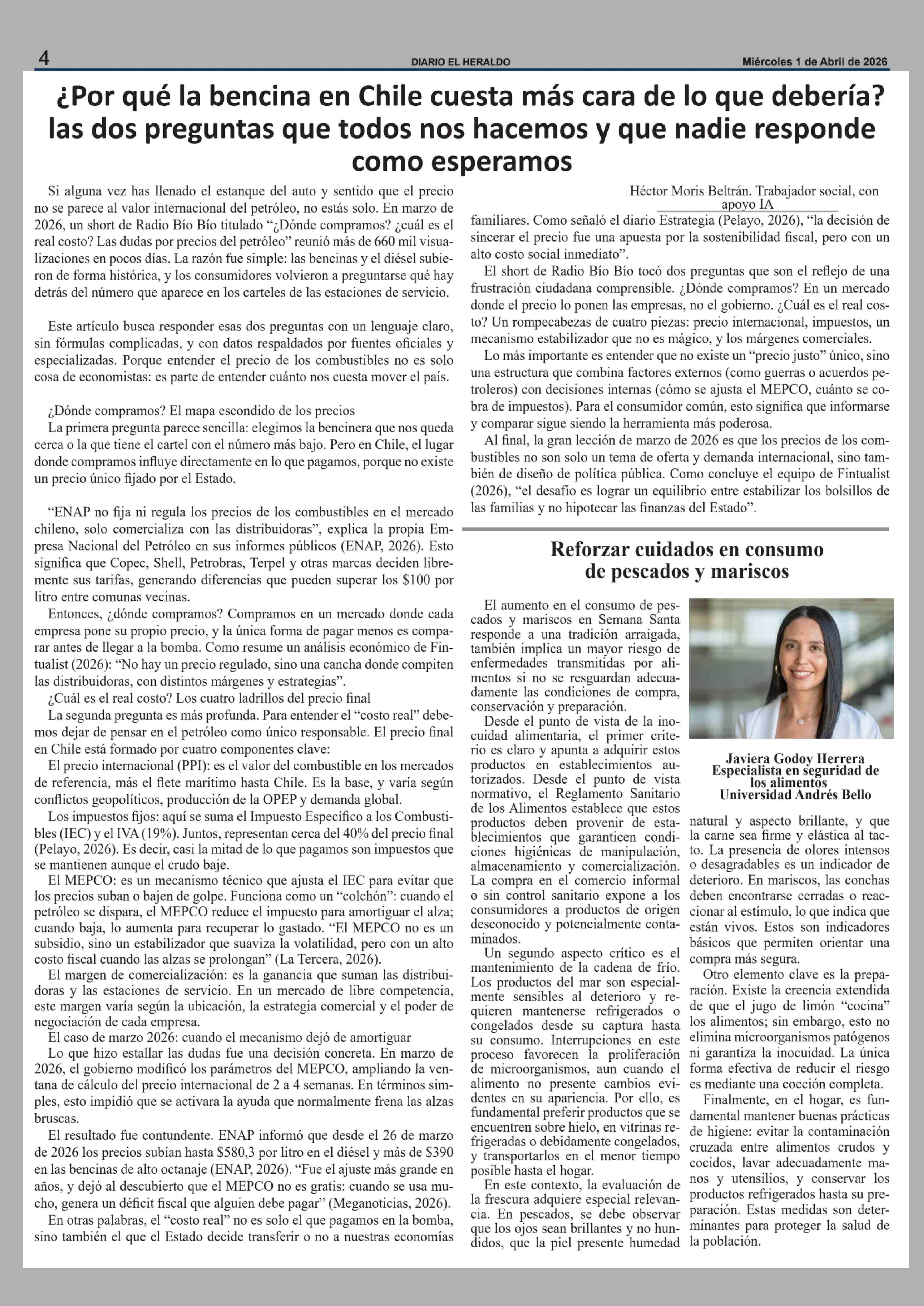Columnas de Opinión: ¿Por qué la bencina en Chile cuesta más cara de lo que debería? las dos preguntas que todos nos hacemos y que nadie responde como esperamos 01-04-2026 El Heraldo |