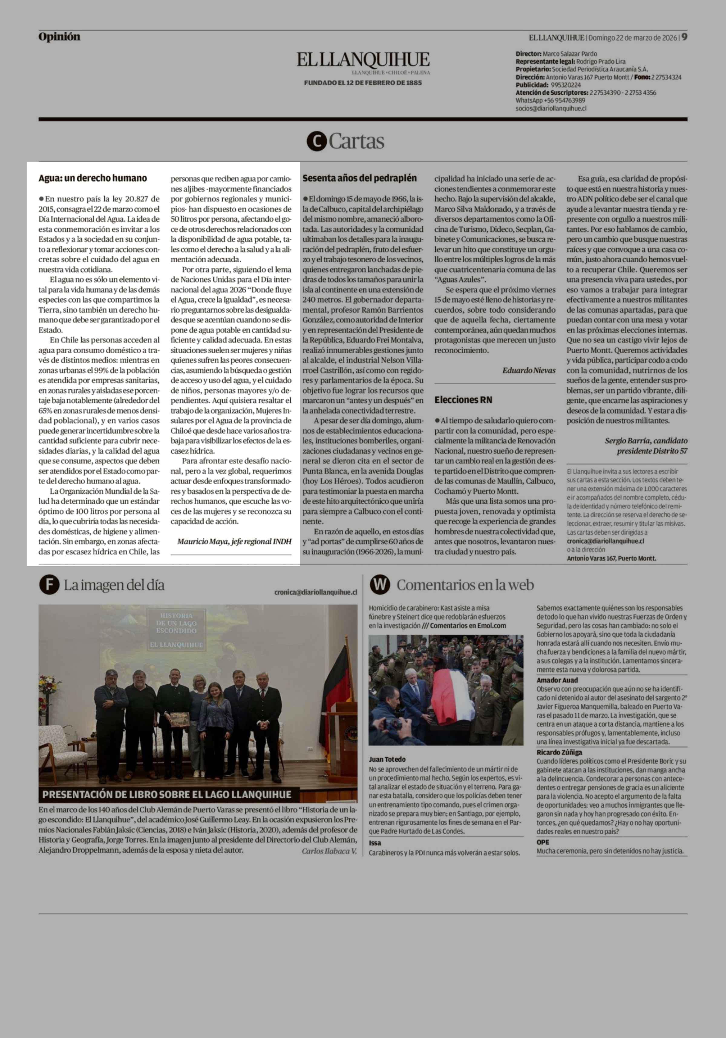 Cartas: Agua: un derecho humano 22-03-2026 El Llanquihue |