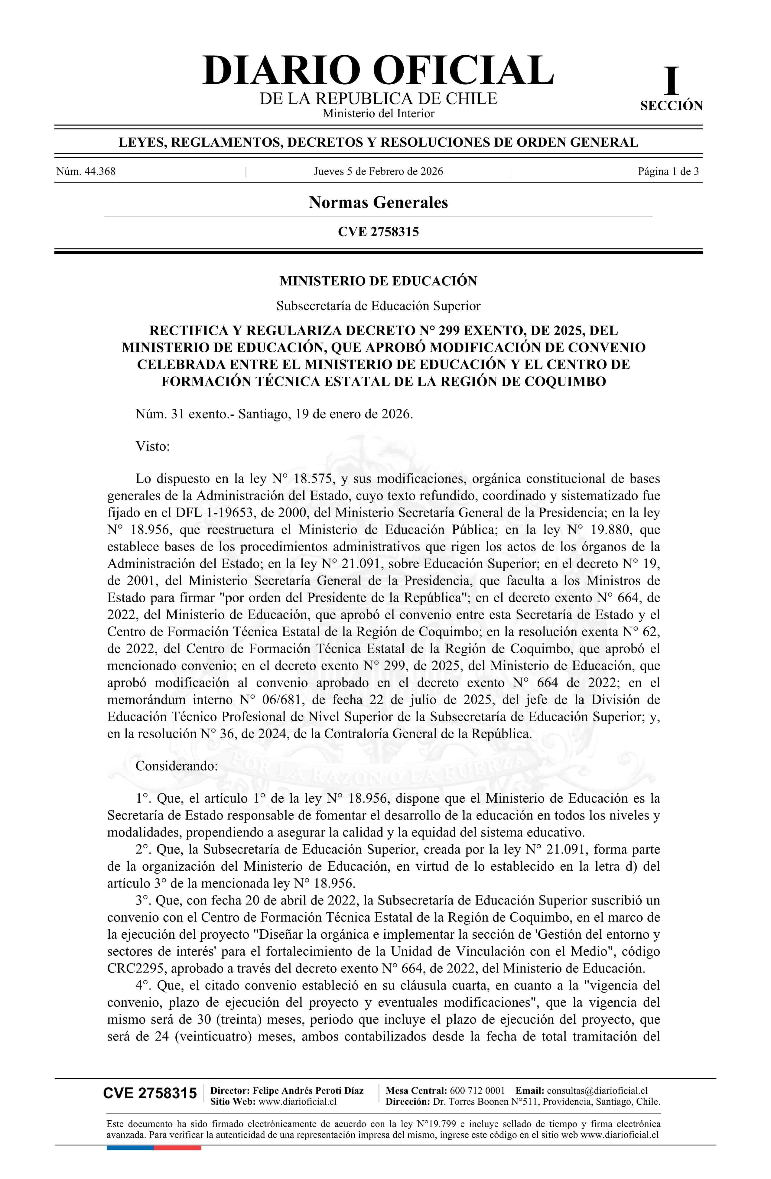 Título: Decreto exento número 31, de 2026.- Rectifica y regulariza decreto N° 299 exento, de 2025, que aprobó modificación de convenio celebrada entre el Ministerio de Educación y el Centro de Formación Técnica Estatal de la Región de Coquimbo