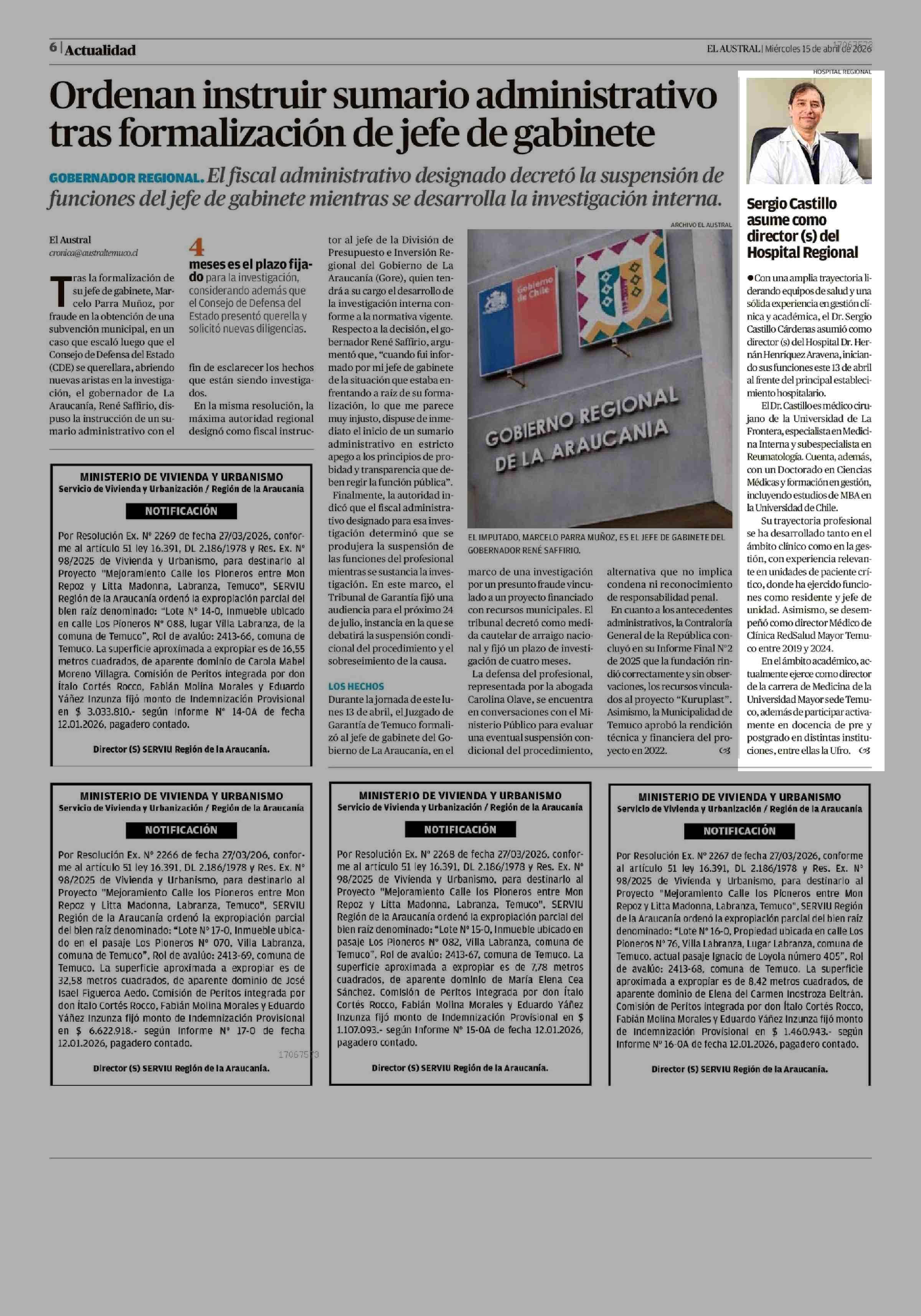 Sergio Castillo asume como director (s) del Hospital Regional 15-04-2026 El Austral de la Araucanía |