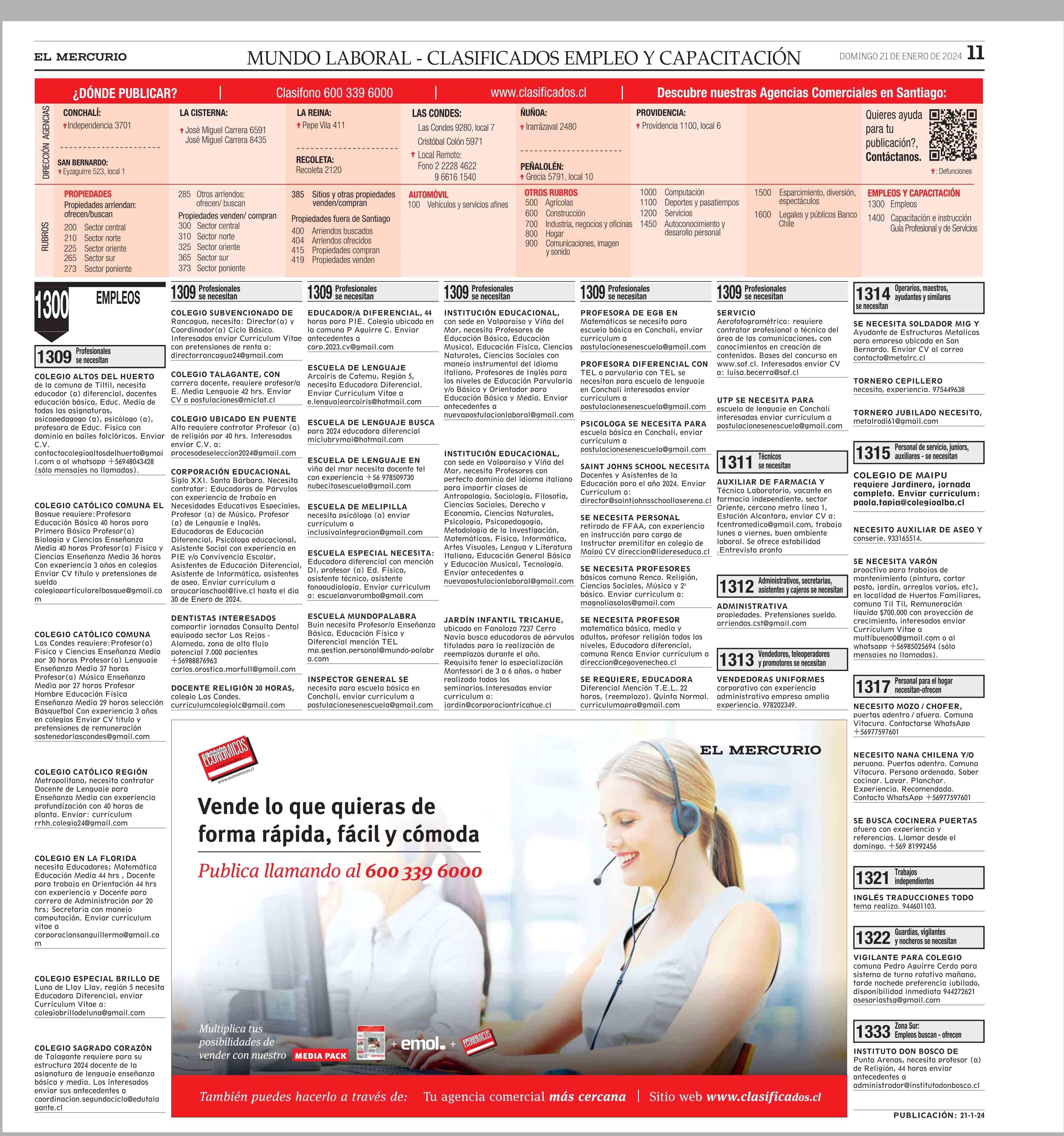 11 MUNDO LABORAL - CLASIFICADOS EMPLEO Y CAPACITACIÓN MUNDO LABORAL - CLASIFICADOS EMPLEO Y CAPACITACIÓN 21-01-2024 El Mercurio |