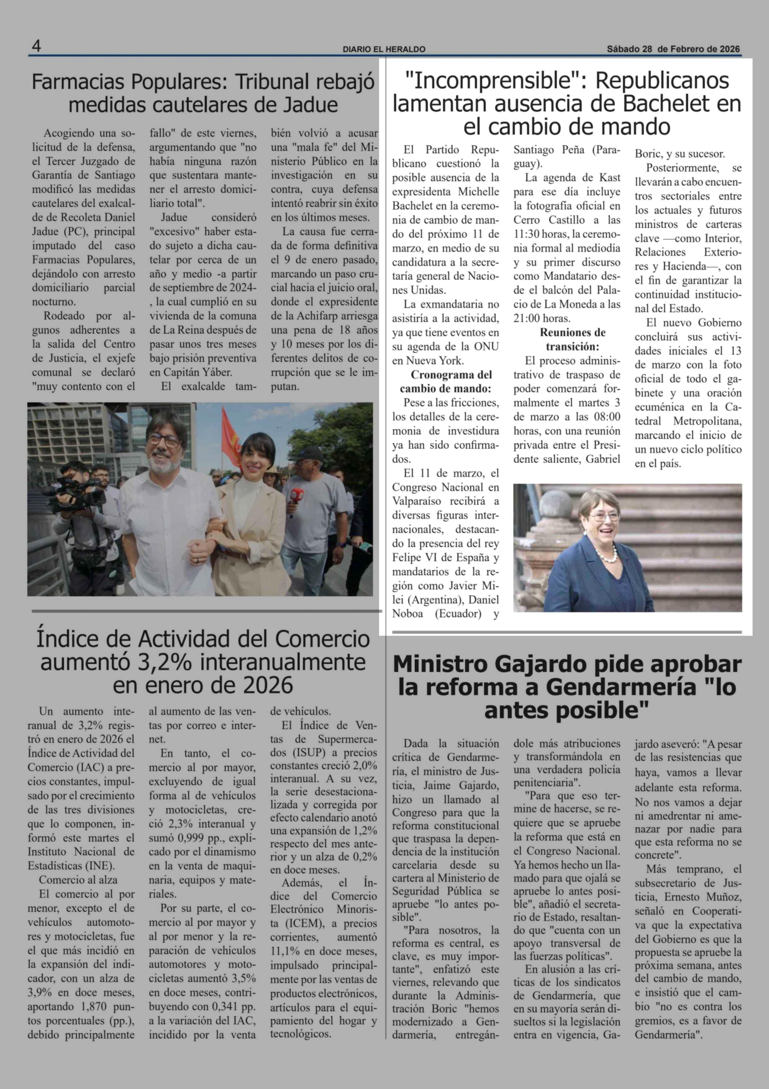 "Incomprensible": Republicanos lamentan ausencia de Bachelet en el cambio de mando 28-02-2026 El Heraldo |