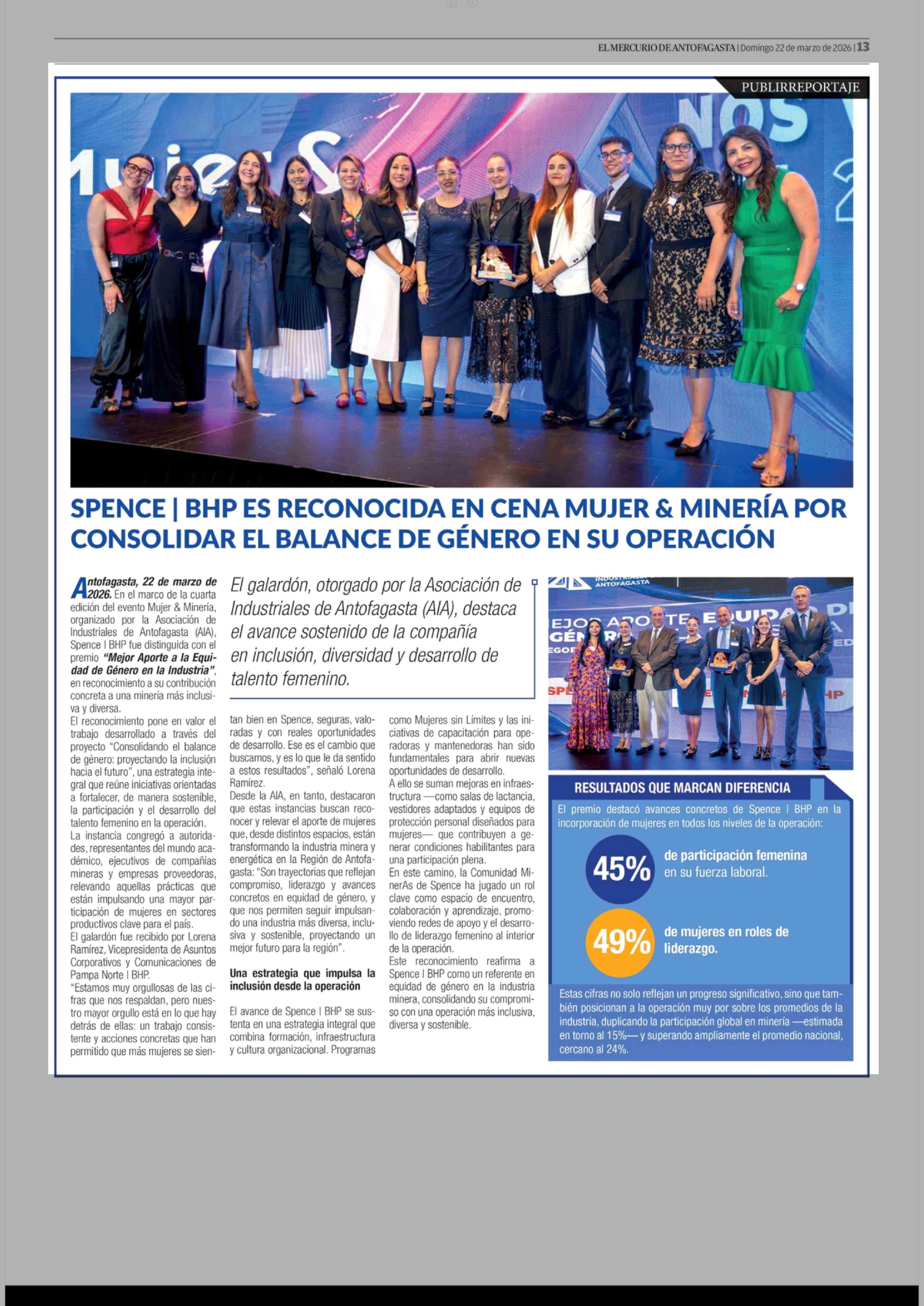 Título: SPENCE | BHP ES RECONOCIDA EN CENA MUJER & MINERÍA POR CONSOLIDAR EL BALANCE DE GÉNERO EN SU OPERACIÓN