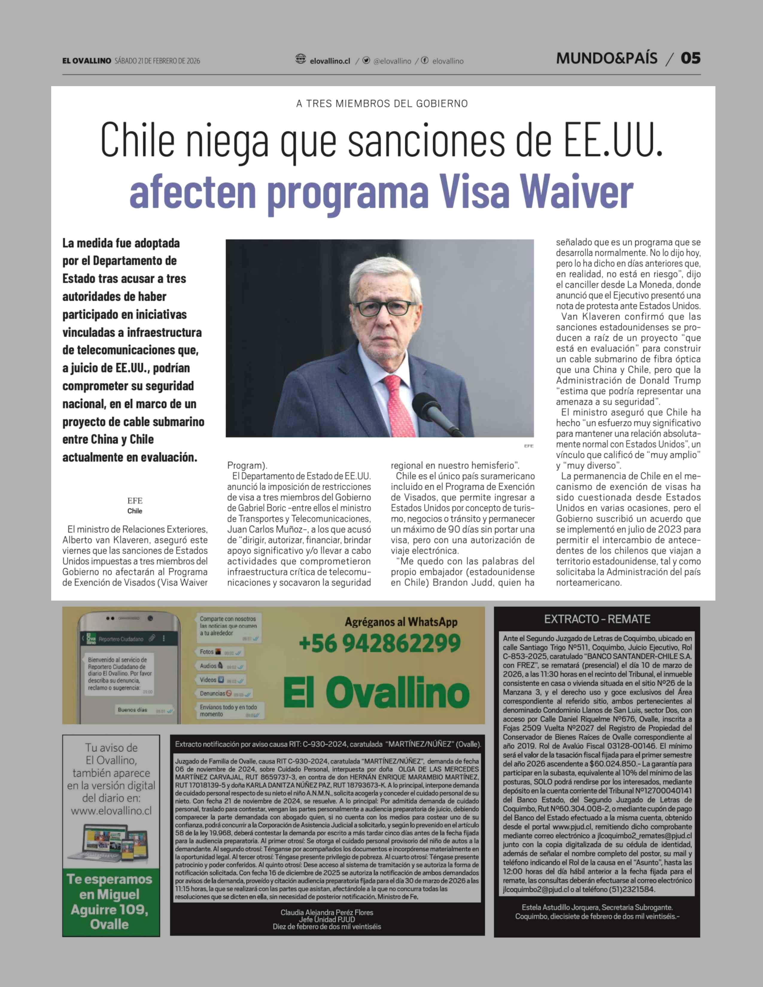 Chile niega que sanciones de EE.UU. afecten programa Visa Waiver 21-02-2026 El Ovallino |