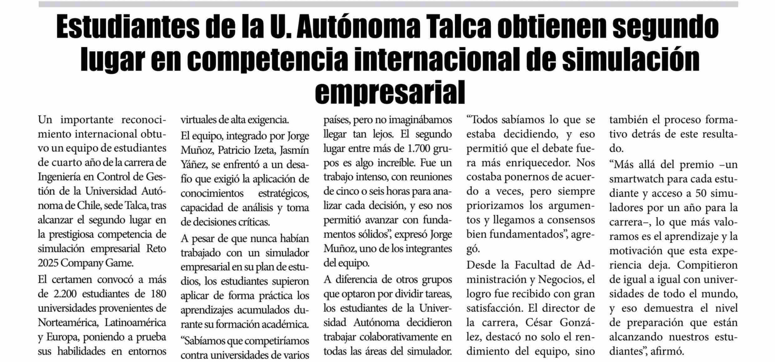 Estudiantes de la U. Autónoma Talca obtienen segundo lugar en competencia internacional de simulación empresarial 31-05-2025 El Lector |