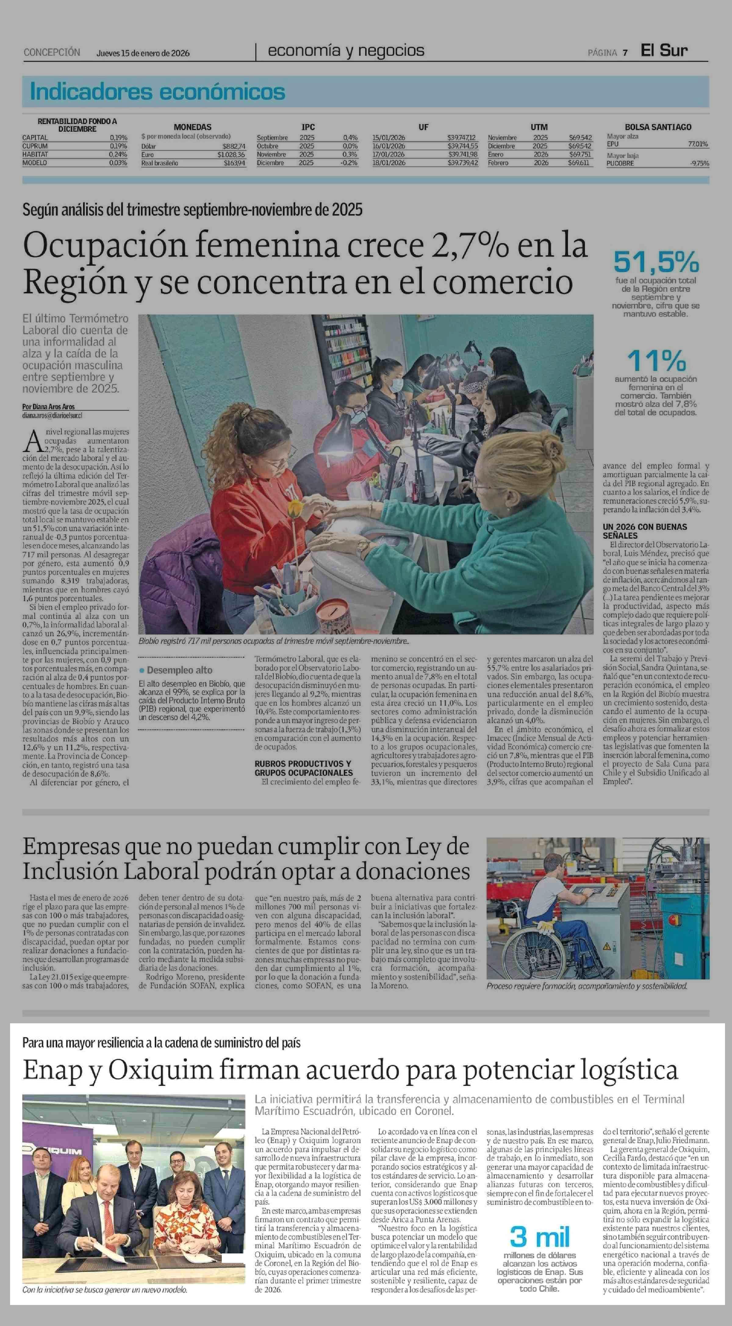 Enap y Oxiquim firman acuerdo para potenciar logística 15-01-2026 El Sur |