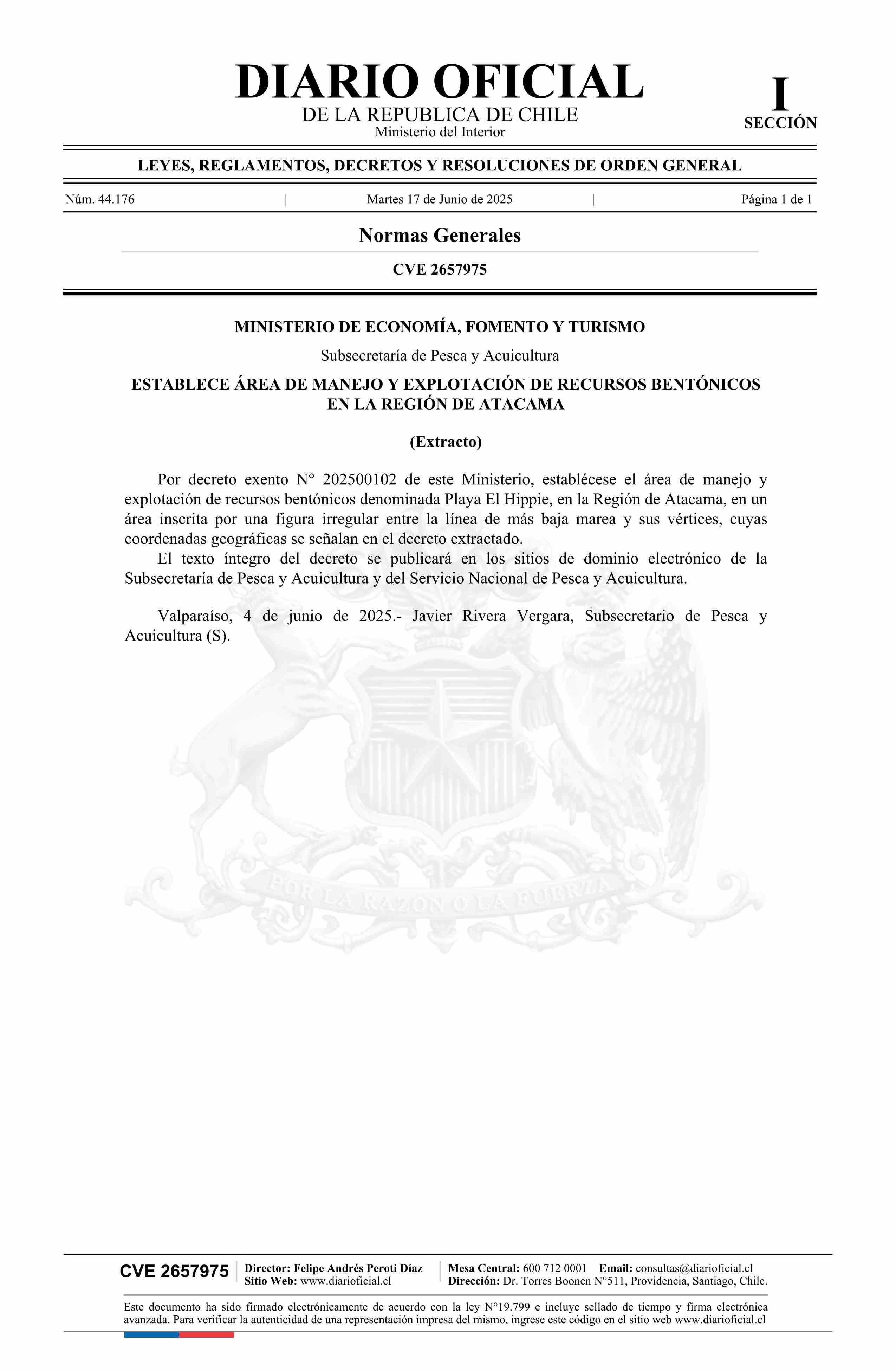 Extracto de decreto exento número 202500102, de 2025.- Establece área de manejo y explotación de recursos bentónicos en la Región de Atacama 17-06-2025 Diario Oficial Edición Electrónica |