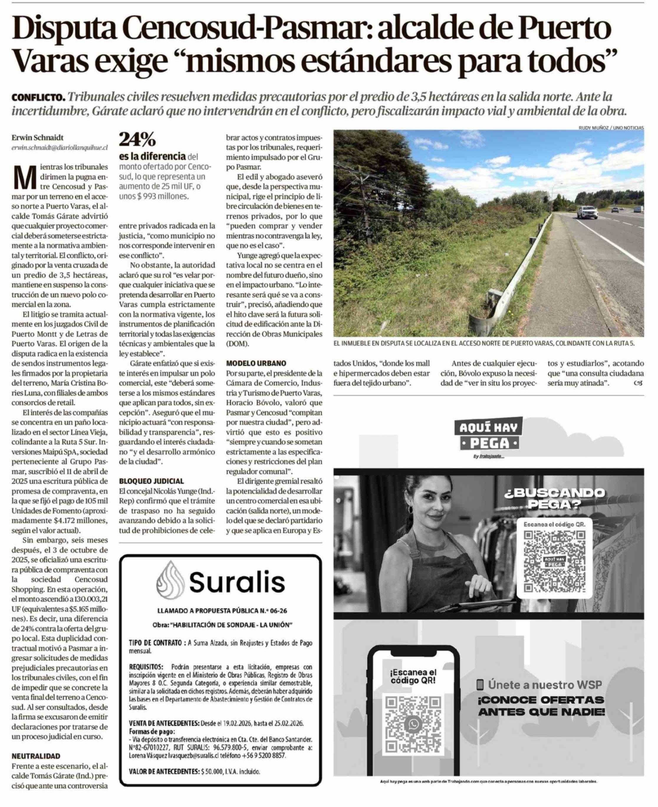 Disputa Cencosud-Pasmar: alcalde de Puerto Varas exige "mismos estándares para todos" 19-02-2026 El Llanquihue |