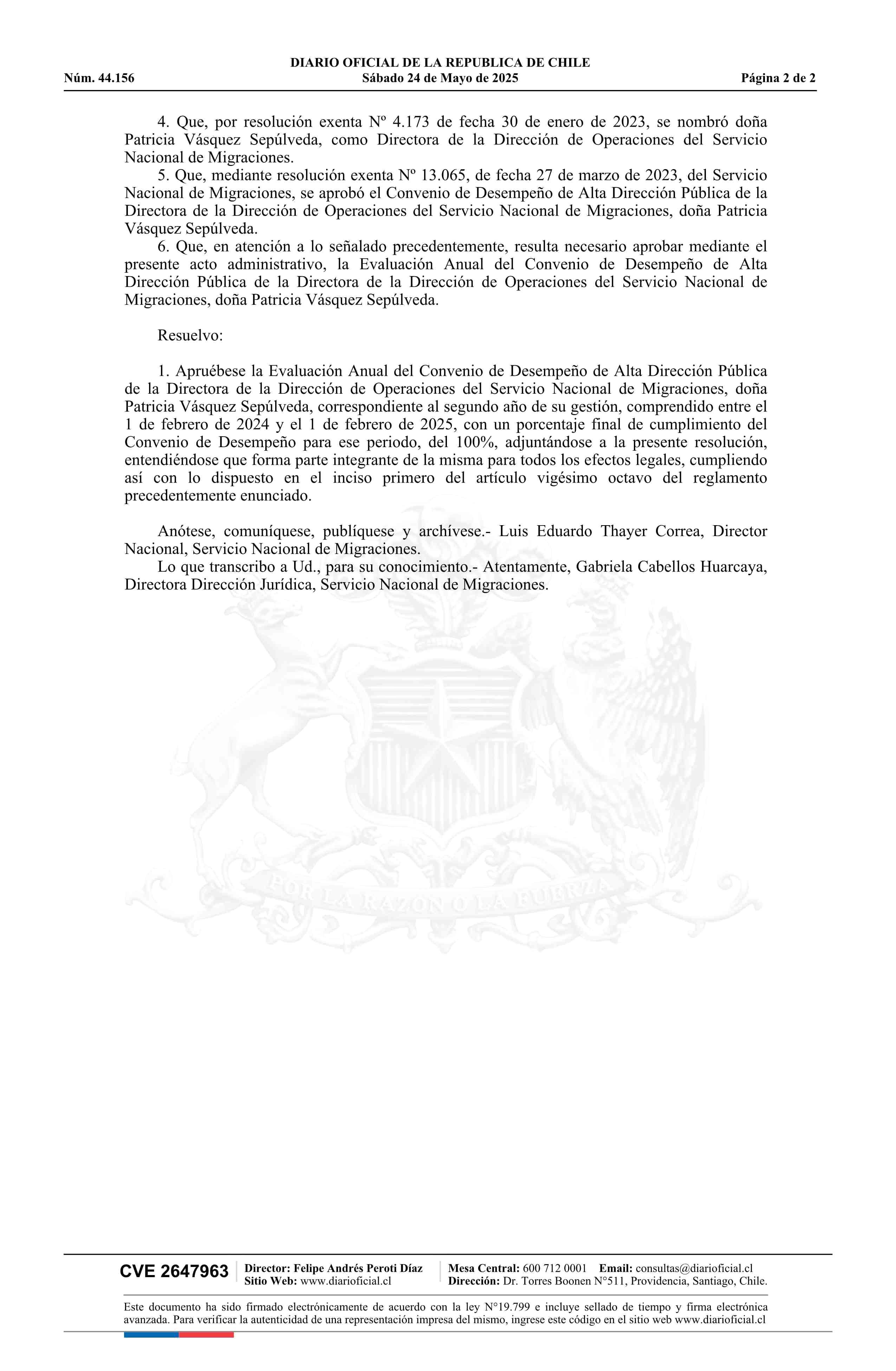 | Título: | Resolución exenta número 16.749, de 2025.- Aprueba Evaluación Anual del Convenio de Desempeño de Alta Dirección Pública de la Directora de la Dirección de Operaciones del Servicio Nacional de Migraciones |