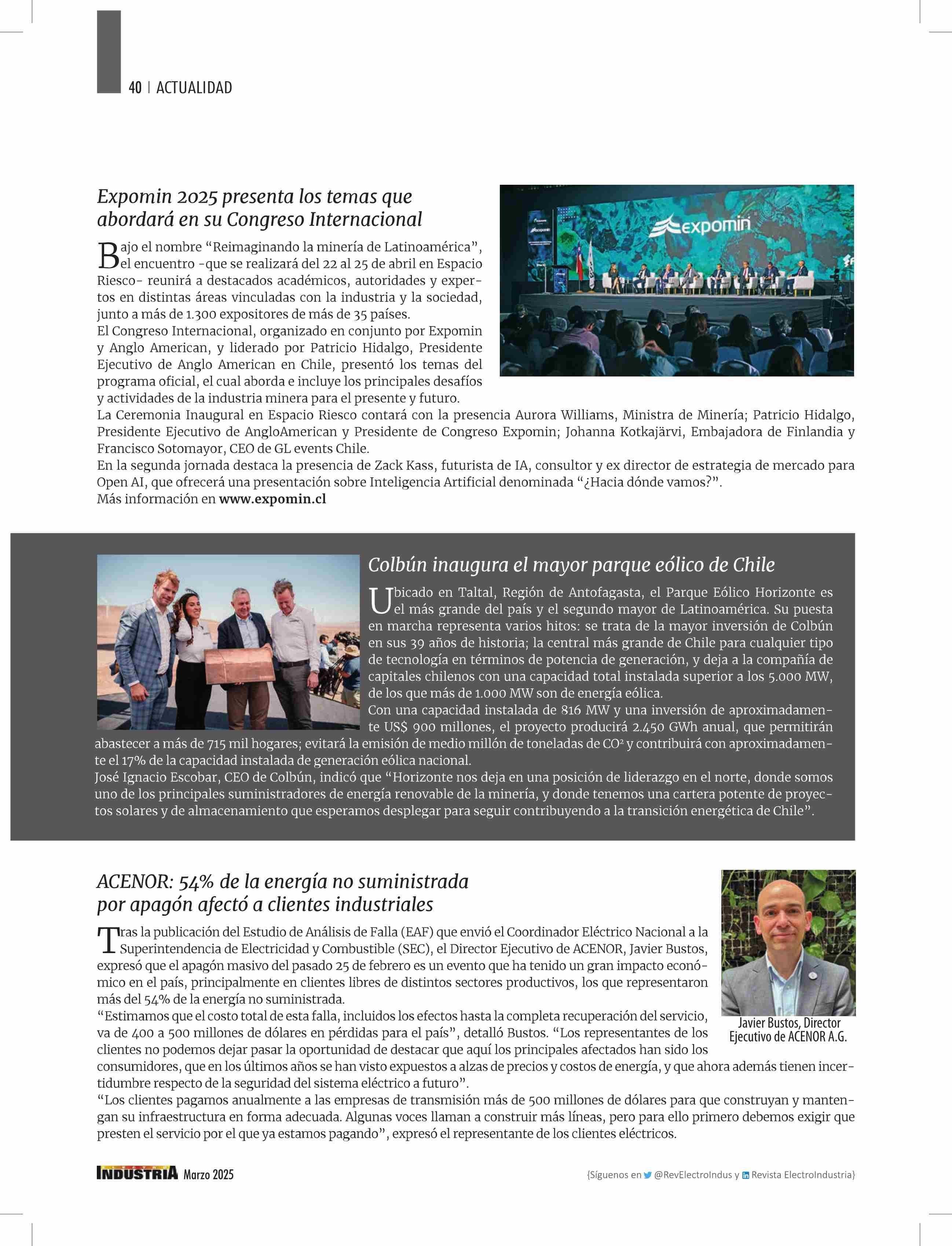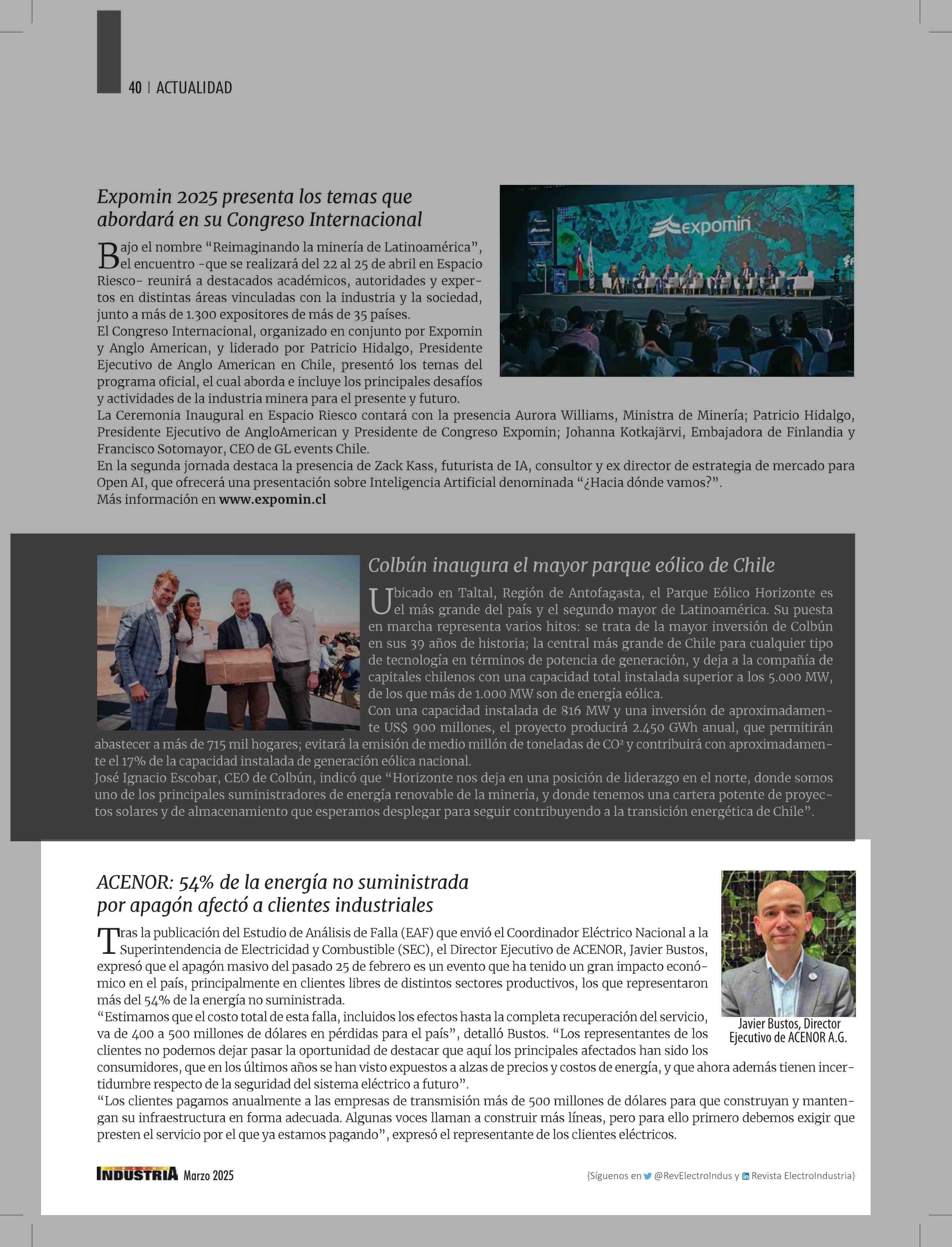 ACENOR: 54% de la energía no suministrada por apagón afectó a clientes industriales 31-03-2025 Revista Electro Industria |