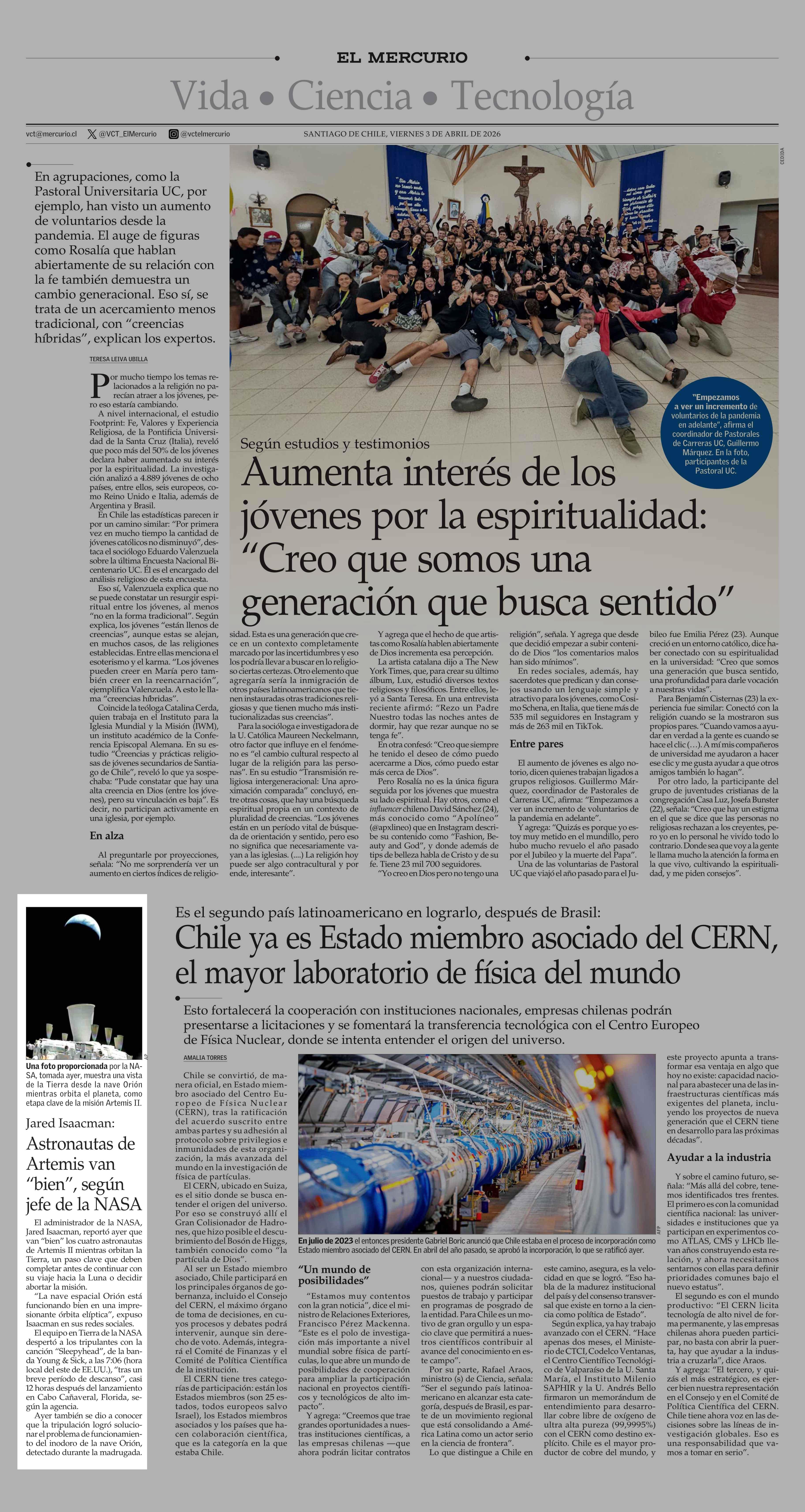 Astronautas de Artemis van “bien”, según jefe de la NASA 03-04-2026 El Mercurio |