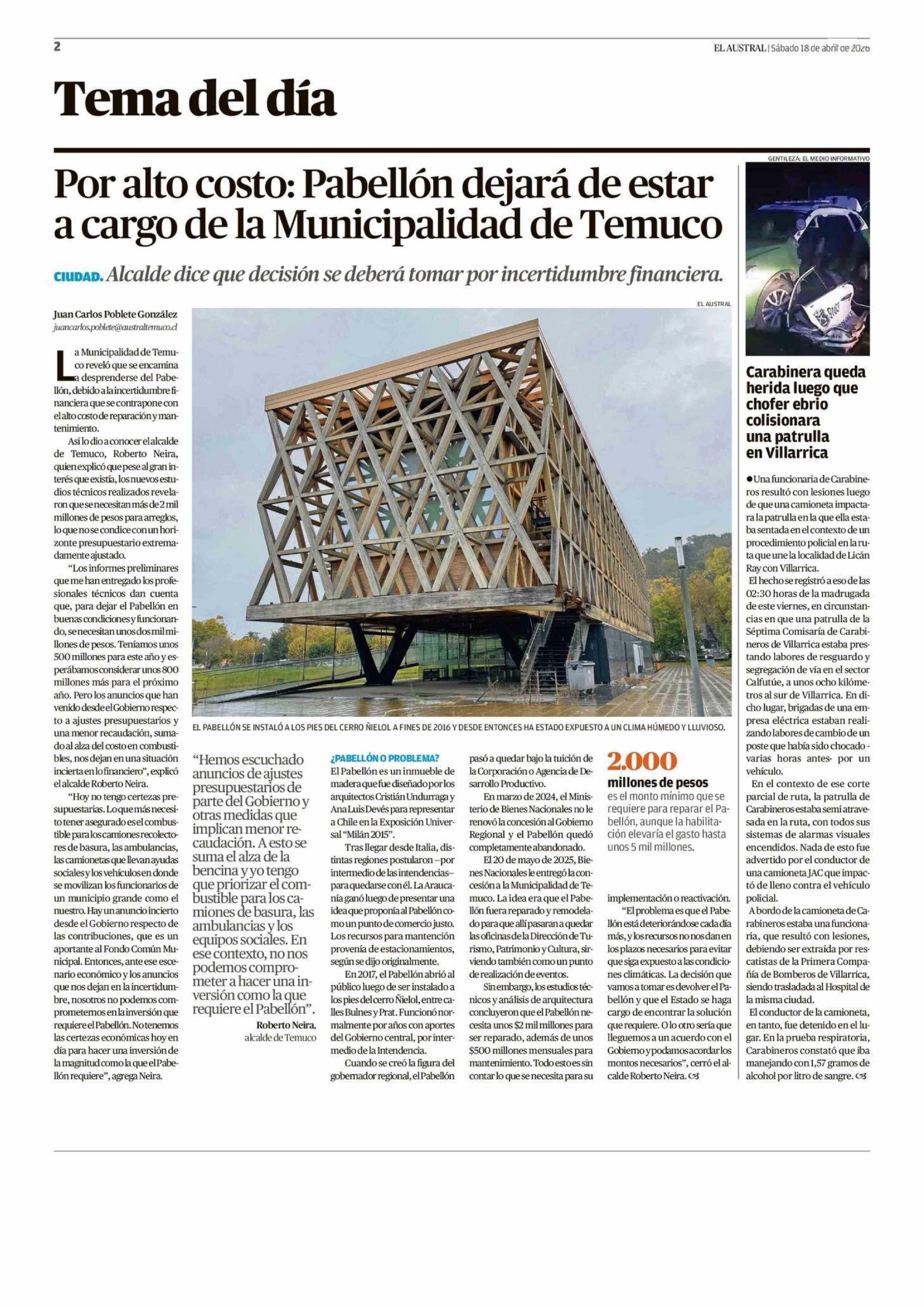 Por alto costo: Pabellón dejará de estar a cargo de la Municipalidad de Temuco 18-04-2026 El Austral de la Araucanía |